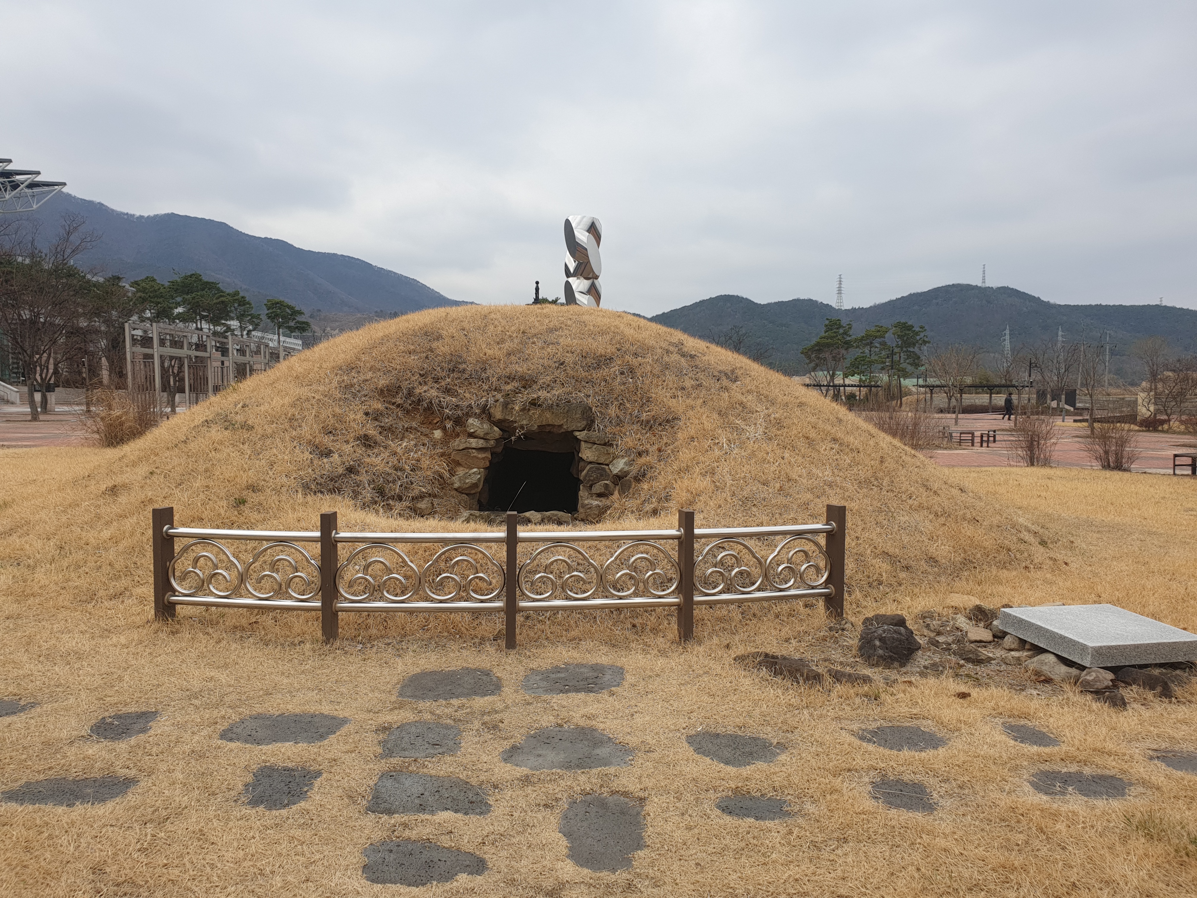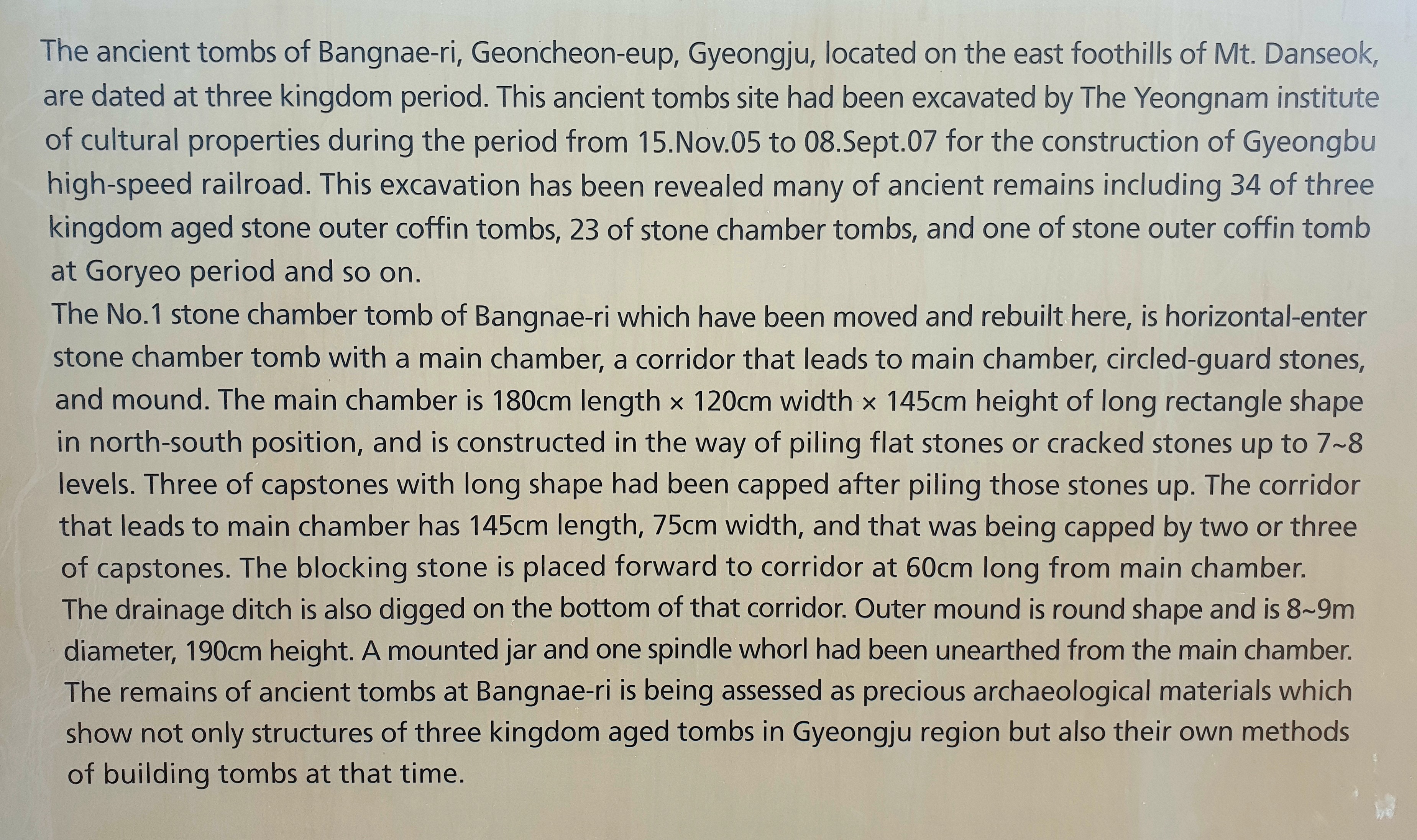 The No. 1 stone chamber tomb of Bangnae-ri which have been moved and rebuilt here, is horizontal-enter stone chamber tomb with a main chamber, a corridor that leads to main chamber, circled-guard stones, and mound.