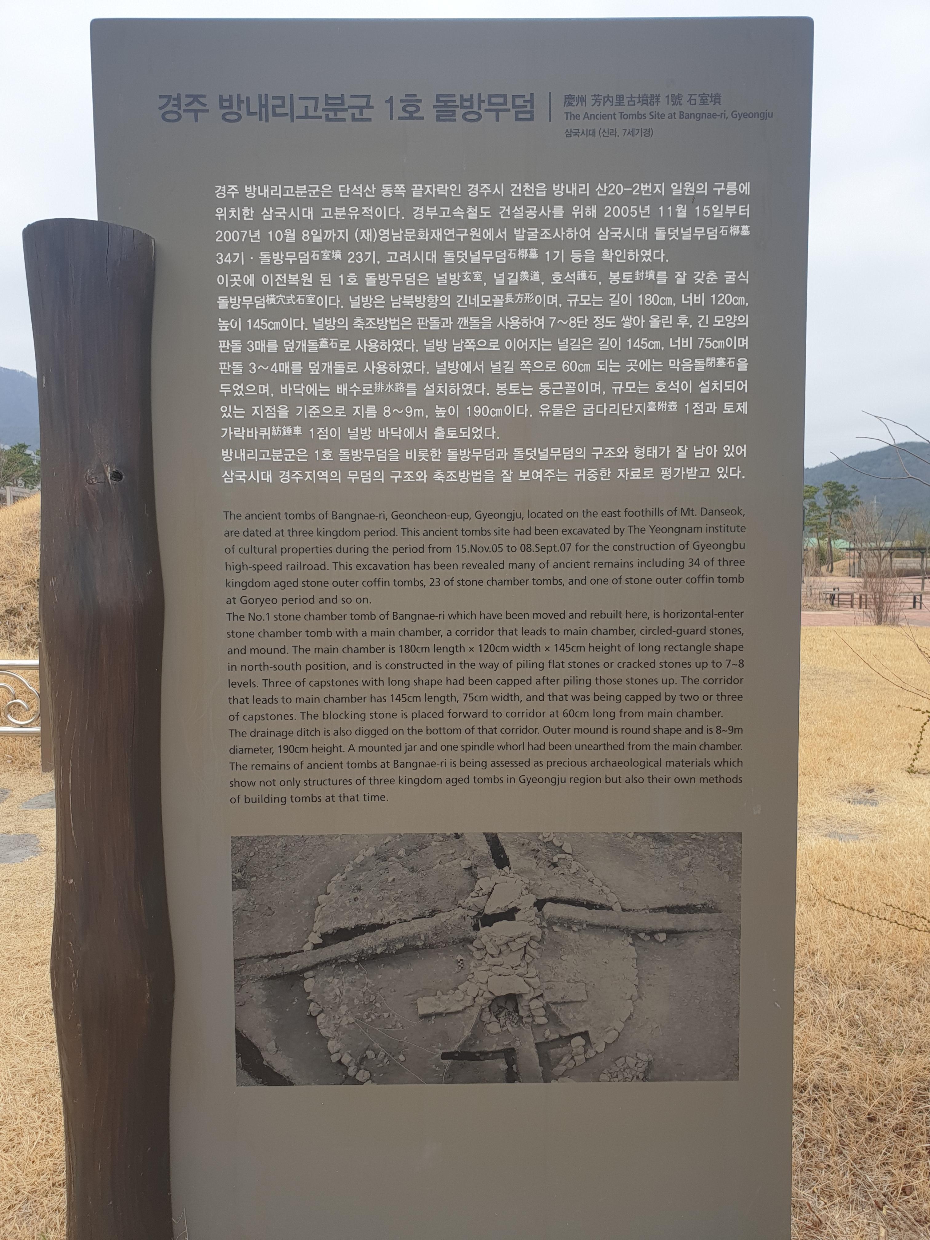 The remains of ancient tombs at Bangnae-ri is being assessed as precious archaeological materials which show not only structures of three kingdom aged tombs in Gyeongju region but also their own methods of building tombs at that time.
