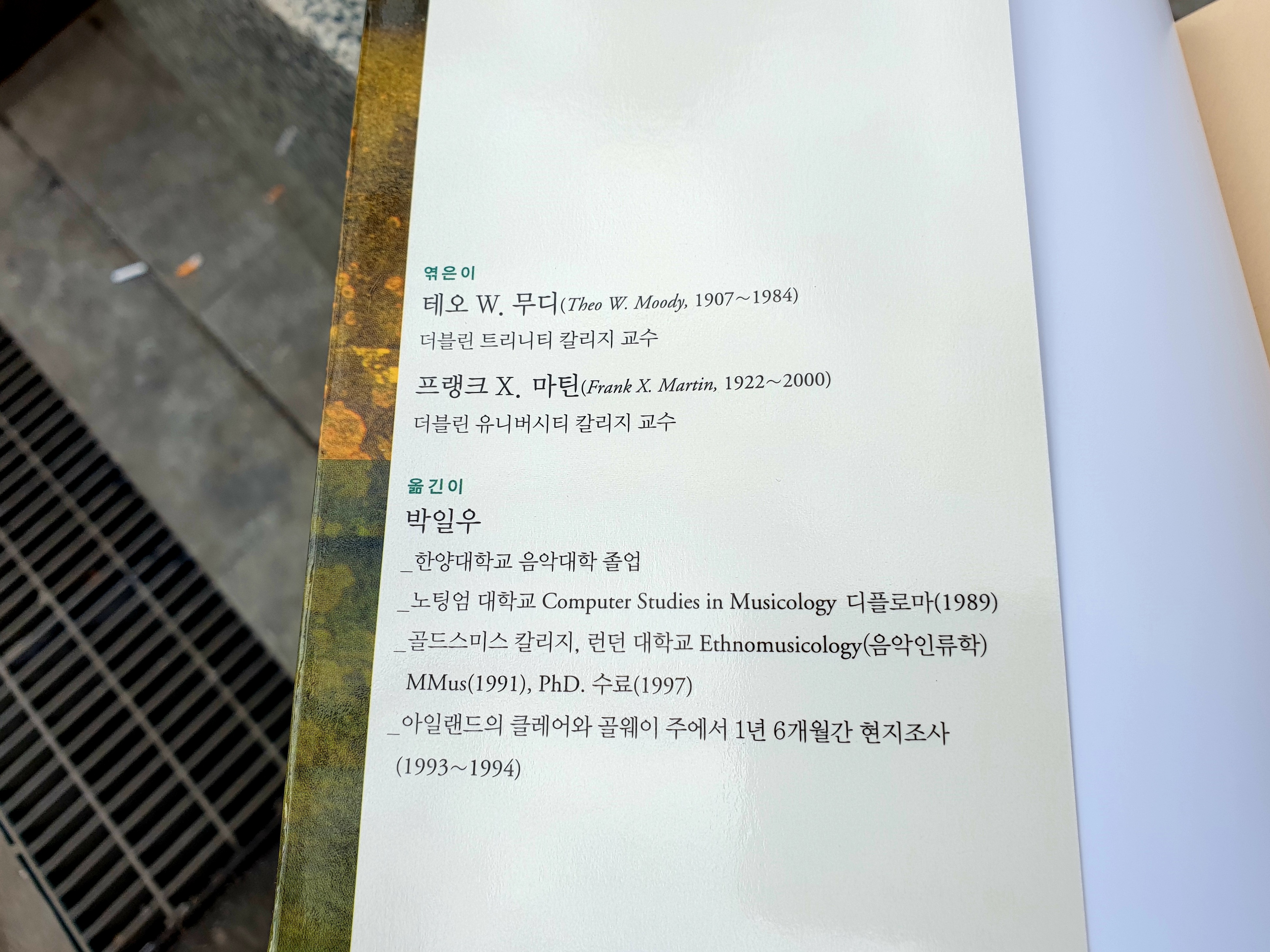 역자 박일우 (Park Il-woo,朴一愚) 씨 경력이 조금은 의외라, 한양대학교 음악대학을 졸업하고 영국 골드스미스컬리지(런던대학교)에서 음악인류학 음악석사·박사를 수료했으며 이 책 출간 당시에는 중앙대학교에서 세계음악사를 강의 중이었단다. 이런 사람이 어떤 인연으로 이 책을 번역하게 되었는지는 아마 본문에 나올 법한데 아직 내가 손을 대지 못했다.