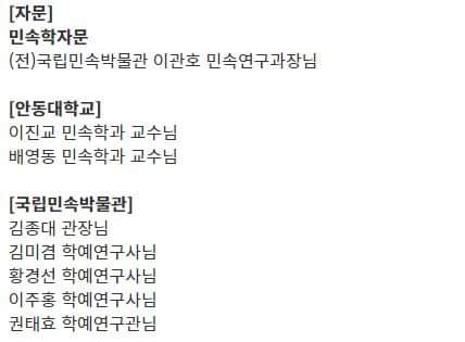 이를 보면 민박과 안동대 민속학이 많은 자문을 한 것으로 나온다.