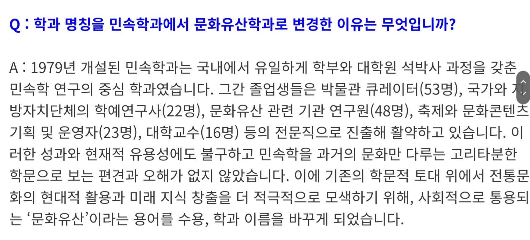 그에 의하면 학과 명칭은 올해 3월에 시행됐다. 2년 전 25명 정원에 12명이 지원해 반토막이 났다. 학과가 존폐 위기로 몰렸다. 원인은 민속에 있다고 판단했다. 아무도 민속을 반기지 않고 또 민속학과가 무엇을 하는 덴지를 물어온다. 민속이라는 말을 살리는 방향으로, 예컨대 민속문화유산학과 등도 고려했다가 아예 뺄 수밖에 없었다.