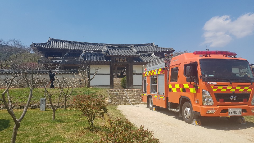 ㅇ 문화재 안전상황실 운영(경상북도, 안동시 상황전파) ㅇ 병산서원, 하회마을 산불 확산 대비 살수 및 진화인력 등 대기(1차) - 소방차 2대, 인력(안전경비원, 돌봄사업단, 안동시·경북도 담당자 등 약 30명) |