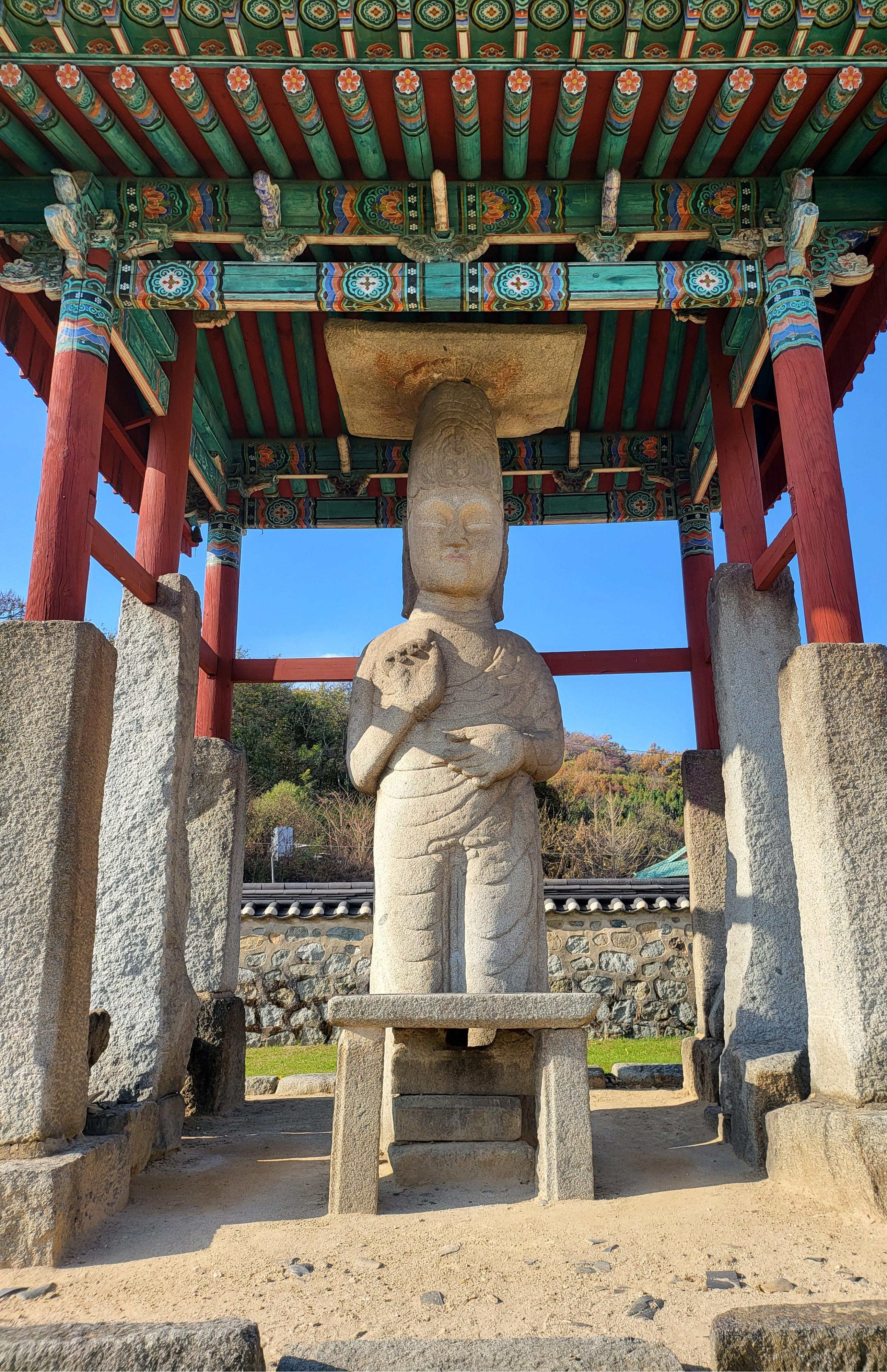 길다란 얼굴에 보관을 쓰고 있는 모습이 논산 관촉사에서 보았던 은진미륵보살과 닮았습니다.