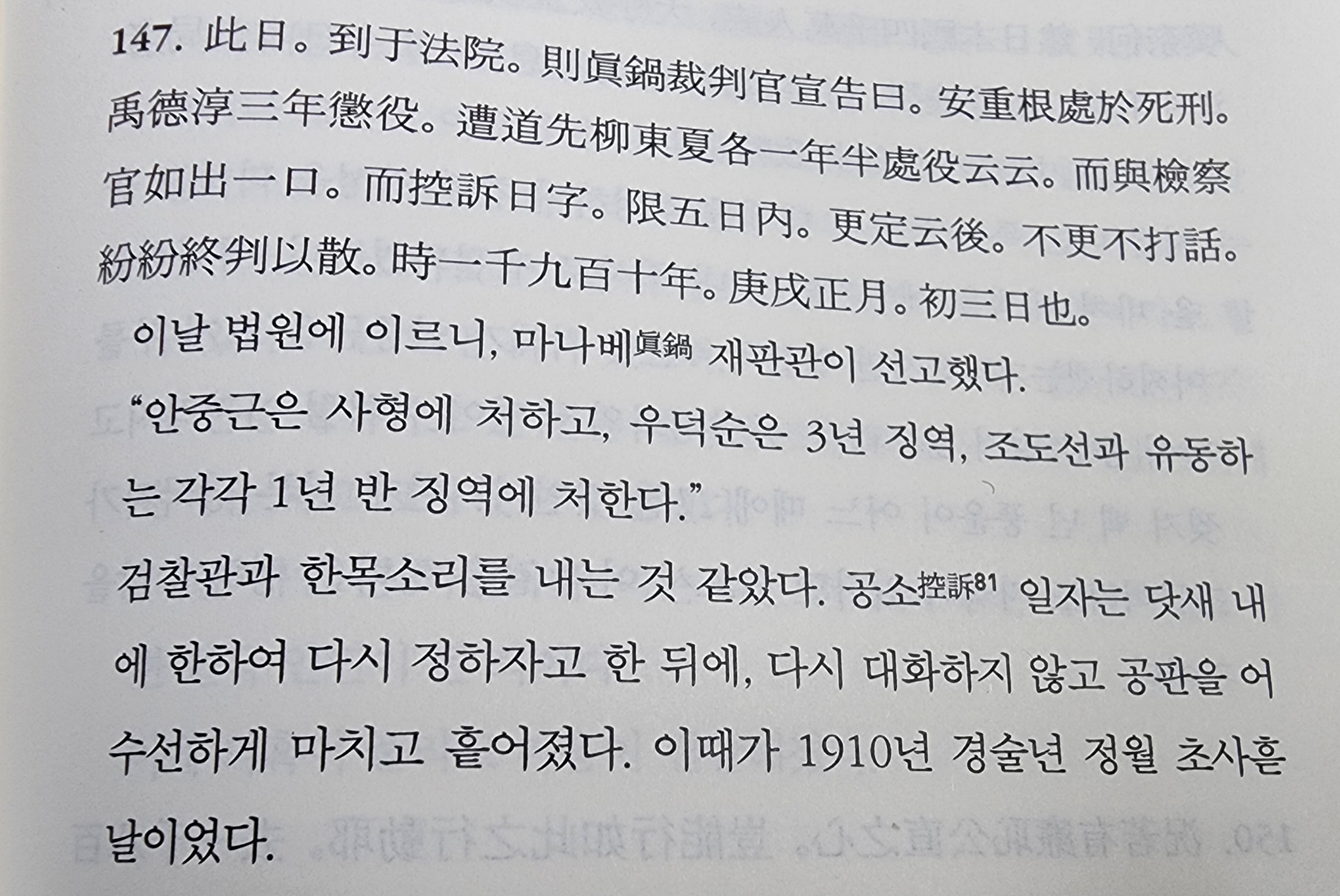 안중근 의사 자서전 「안응칠역사」에 나오는 사형선고를 받는 대목이다.