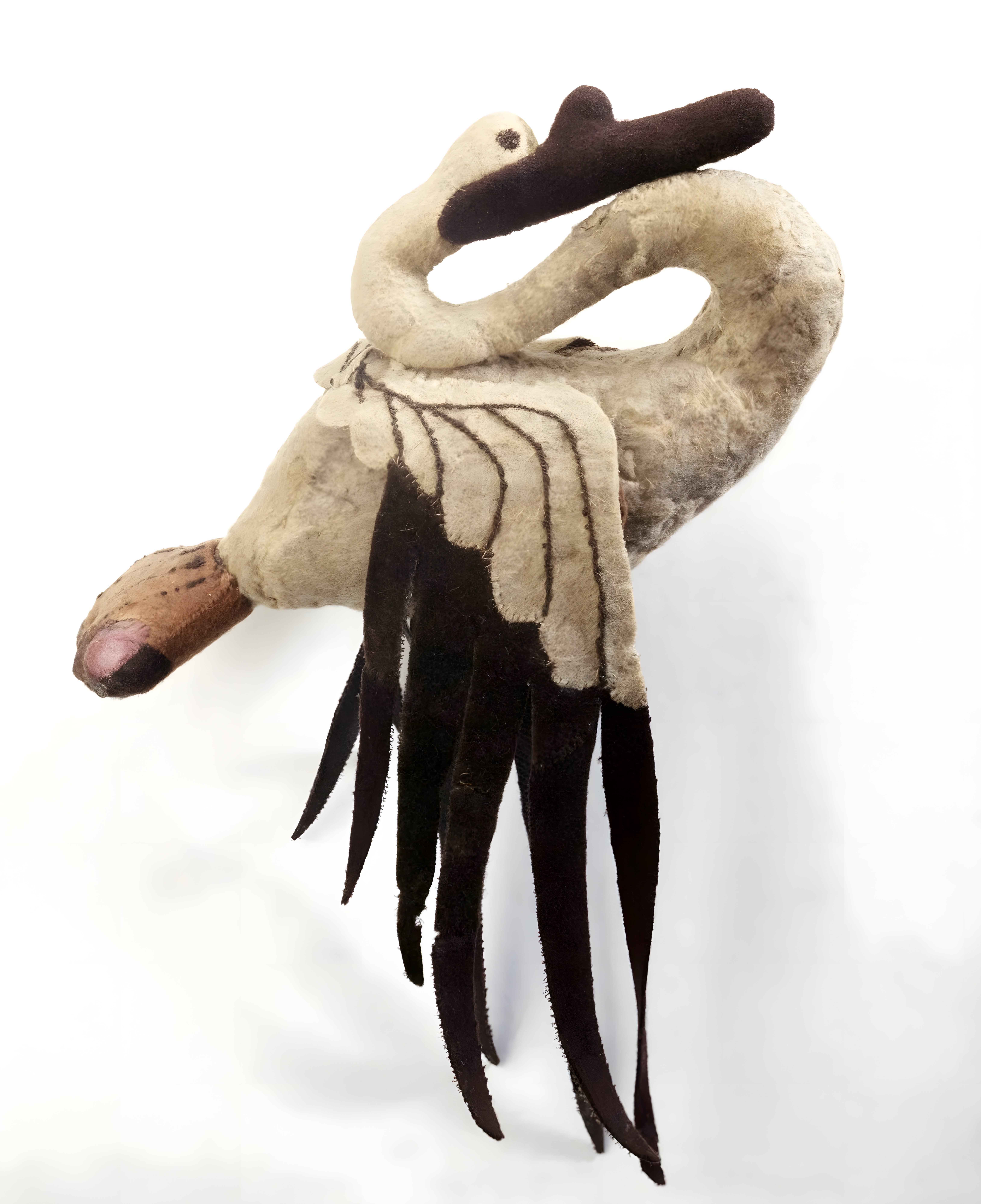 날개와 부리를 포함한 새 형태는 바느질한 펠트를 사용하여 세심하게 만들었다.