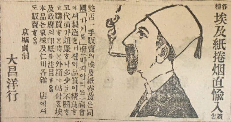 이 사진은 경성 정동의 수입상 대창양행에서 낸 애급지권련 광고다. 카이로의 '바피아듸쓰' 상회에서 낸 진짜 이집트 담배라고 하면서 손님을 끄는데, 상자에 붙은 이집트 정부 인지를 확인하라는 걸 보니 그때도 가짜가 적잖이 나돌았던 모양이다.