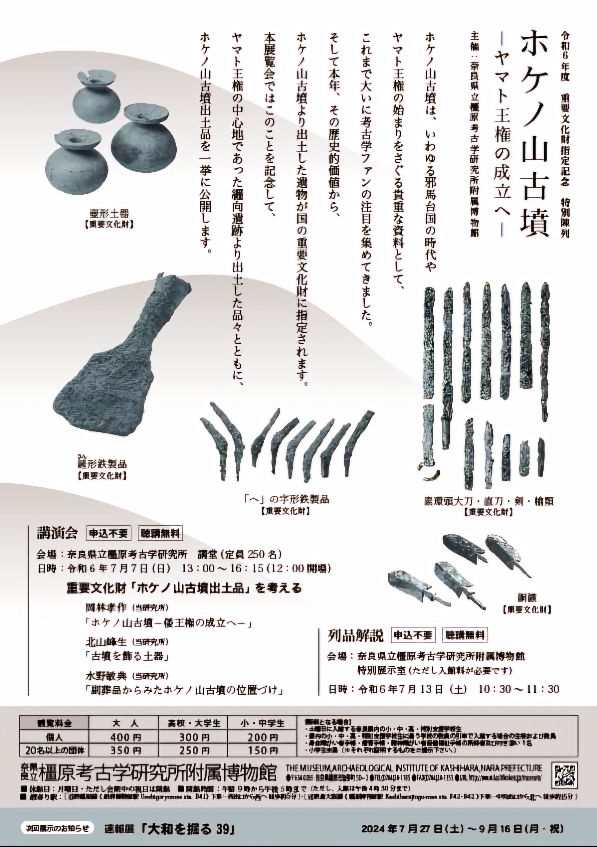 일본 나라현립奈良県立, 곧 나라현이라는 지방행정단위에서 세운 공립이라는 우메하라고고연구소橿原考古学研究所 라는 데서 중요문화재지정기념重要文化財指定記念 특별진열特別陳列로 「호케노야마산고분-야마토왕권을 향하여 [ホケノ山古墳-ヤマト王権の成立へ-」를 개최한다고 알리거니와