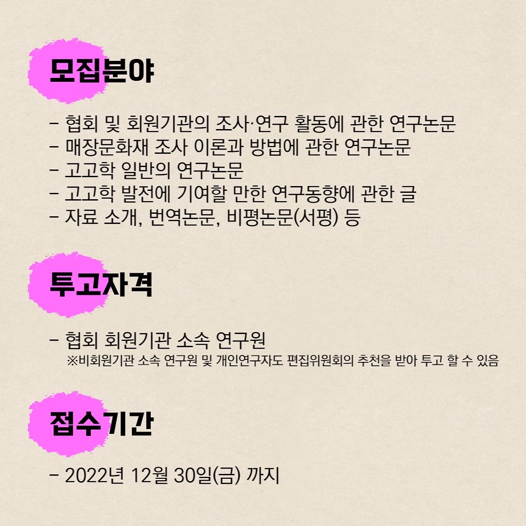 한국문화유산협회 [야외고고학] 제46호 원고 모집 (1) | 2022.12.11 |