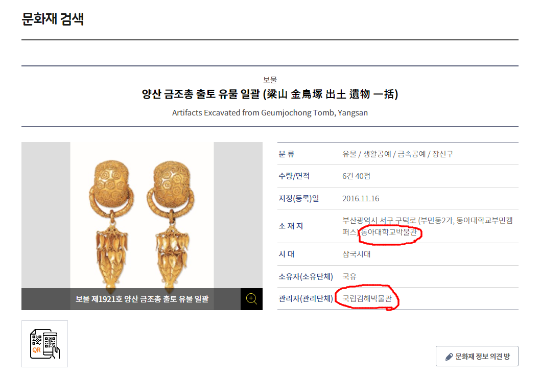 금조총 출토 유물인데 이걸 보면 이 황금귀걸이 한 쌍은 동아대박물관이 보관하고 있고 관리단체는 국립김해박물관이다.이 귀걸이는 당연히 국가귀속되었으니 저리 처리되었을 것이다.