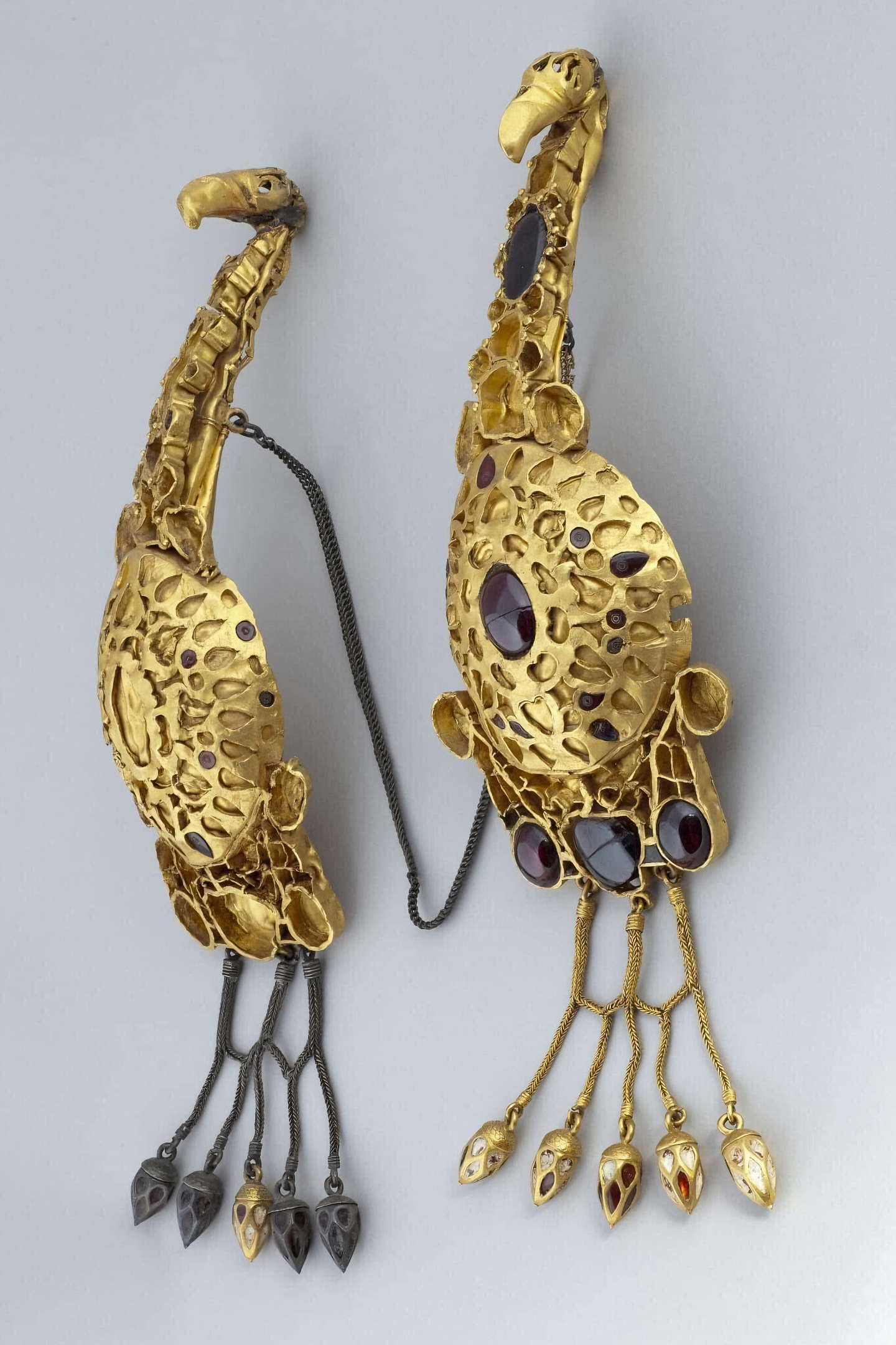 이들 브로치는 금으로 제작하고 가garnets넷으로 장식한 양식화한 새 모양을 하며, 보석 대부분은 시간이 흐르면서 소실되었다.