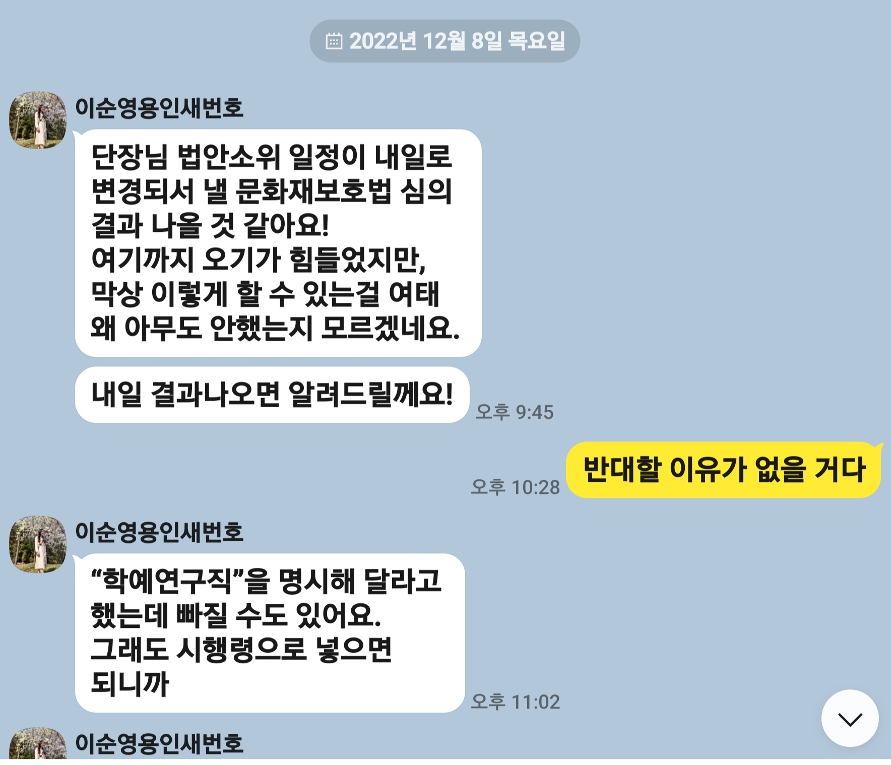 전사처럼 싸워왔던 3년 만에, 우리 스스로 우리의 필요성을 입증하고 문화재보호법 개정안을 발의하도록 이끌어 냈으며,