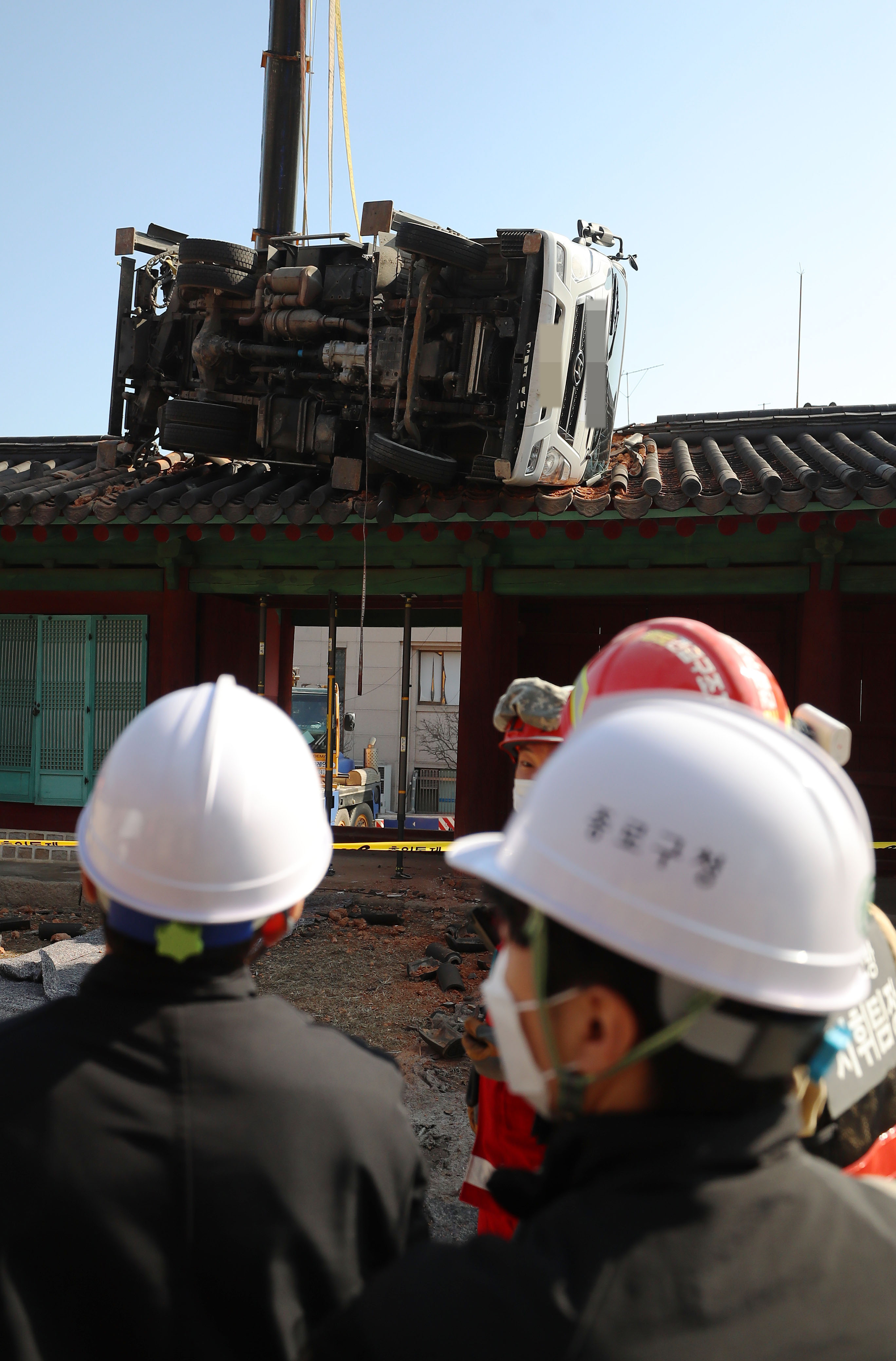 경위를 모르는 사람들이 보면 영화 세트장이라 했을 법하다. 어벤져스 세트장에서나 볼 법한 장면이다. 다친 사람 없으니 사다리차가 곤두박질한 것은 좋다 이거다. 한데 하필 그것이 곤두박질한 데가 지붕이라니? 것도 그 유서깊은 성균관 문묘 건물 지붕이라니?