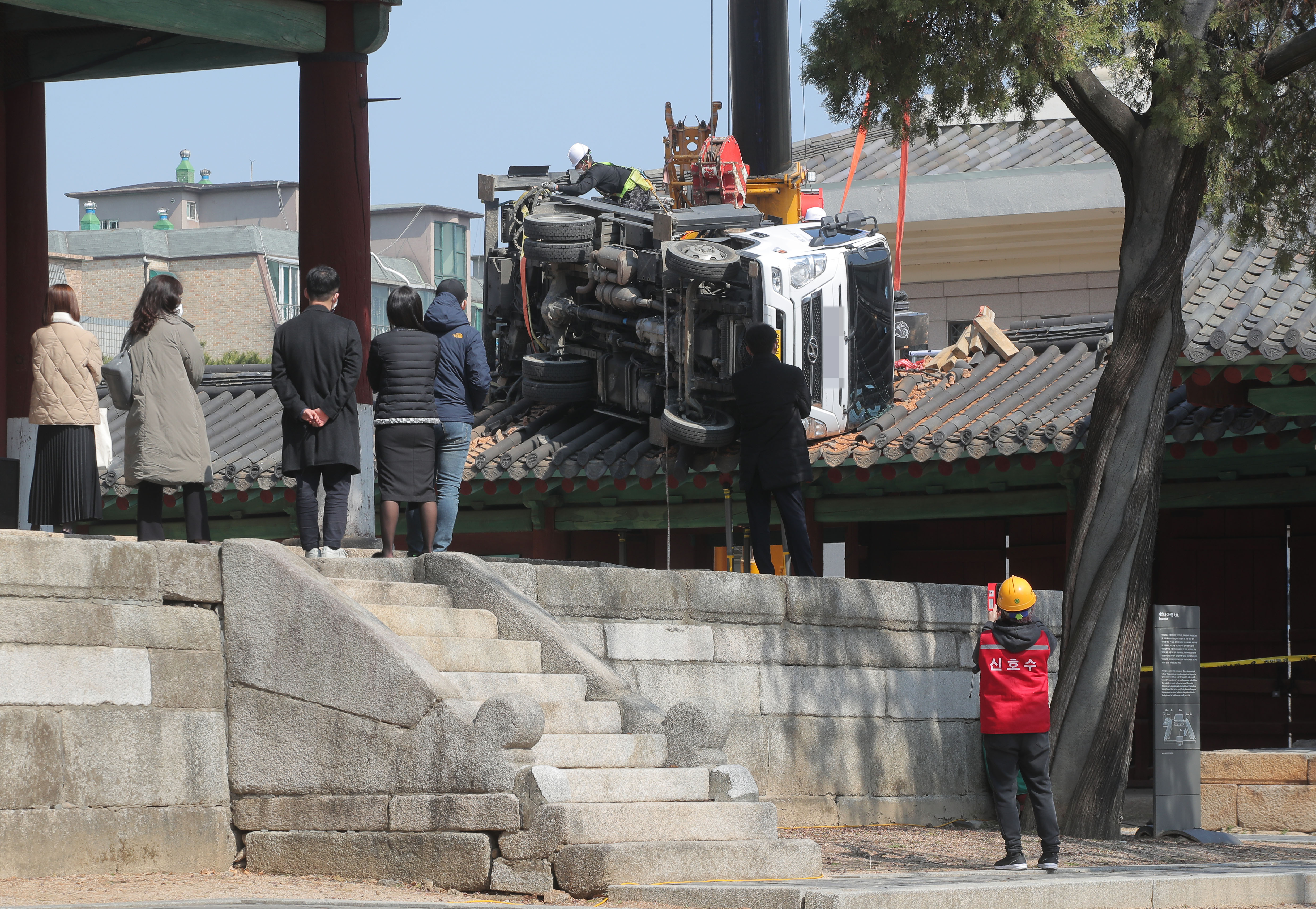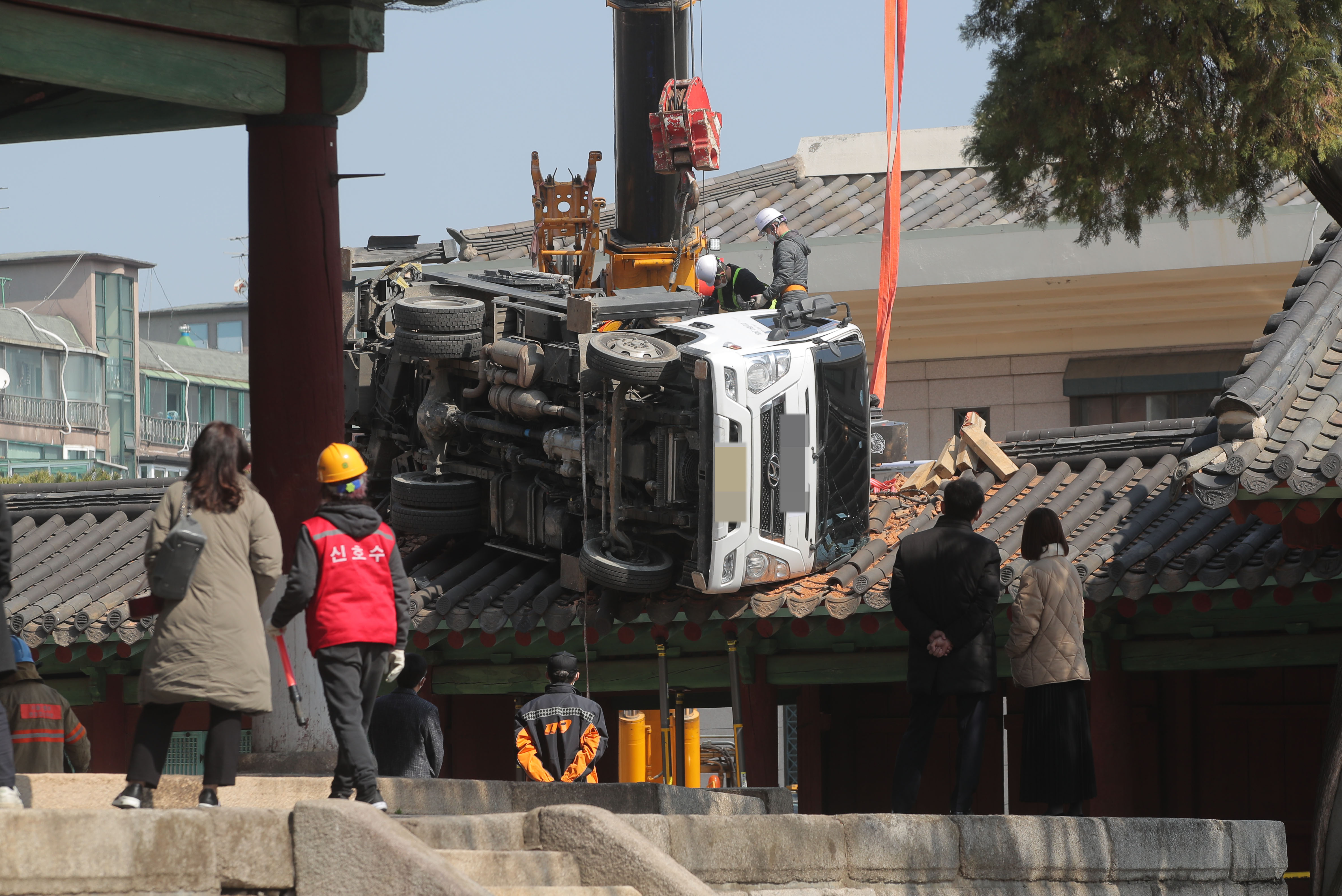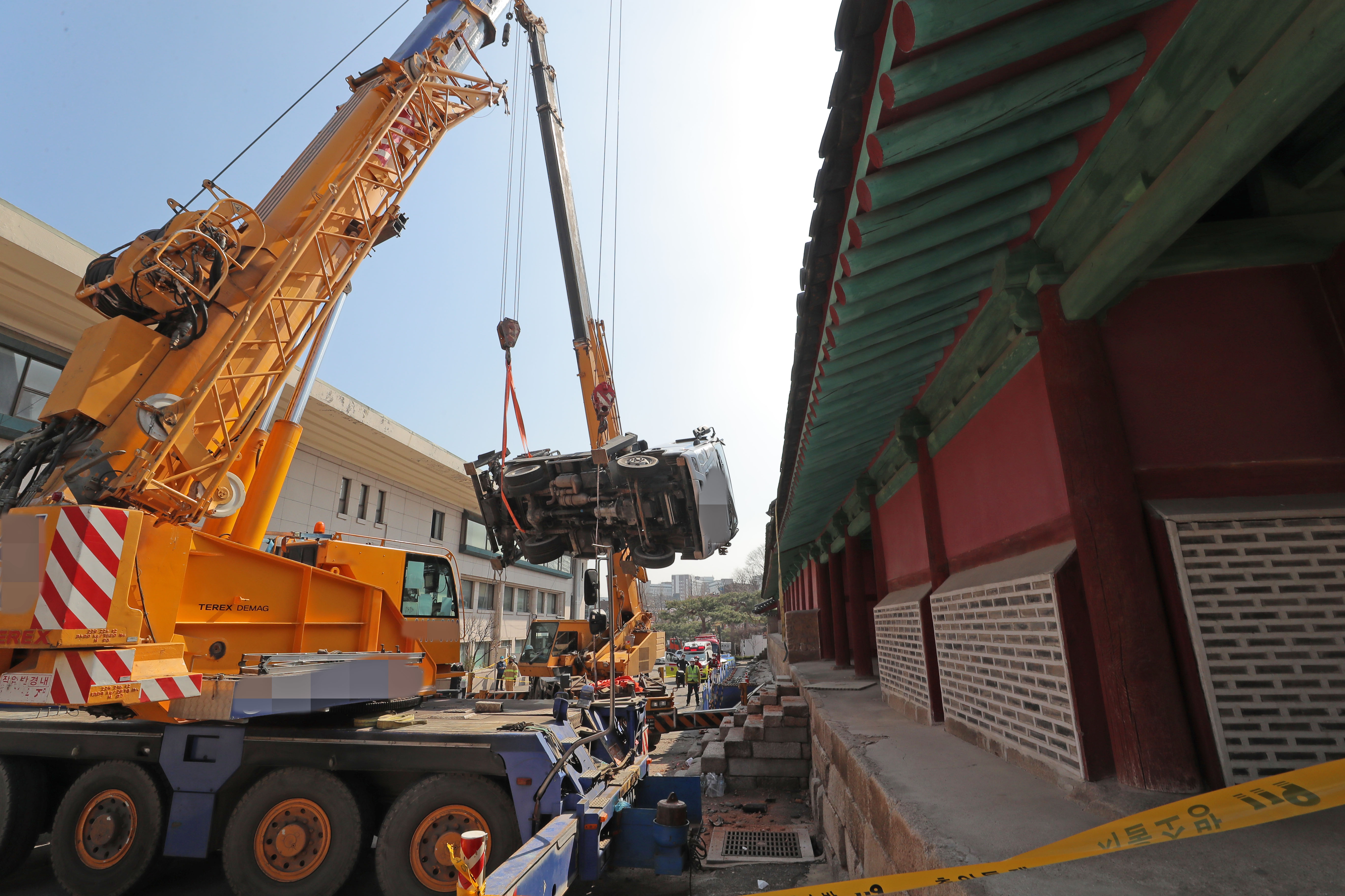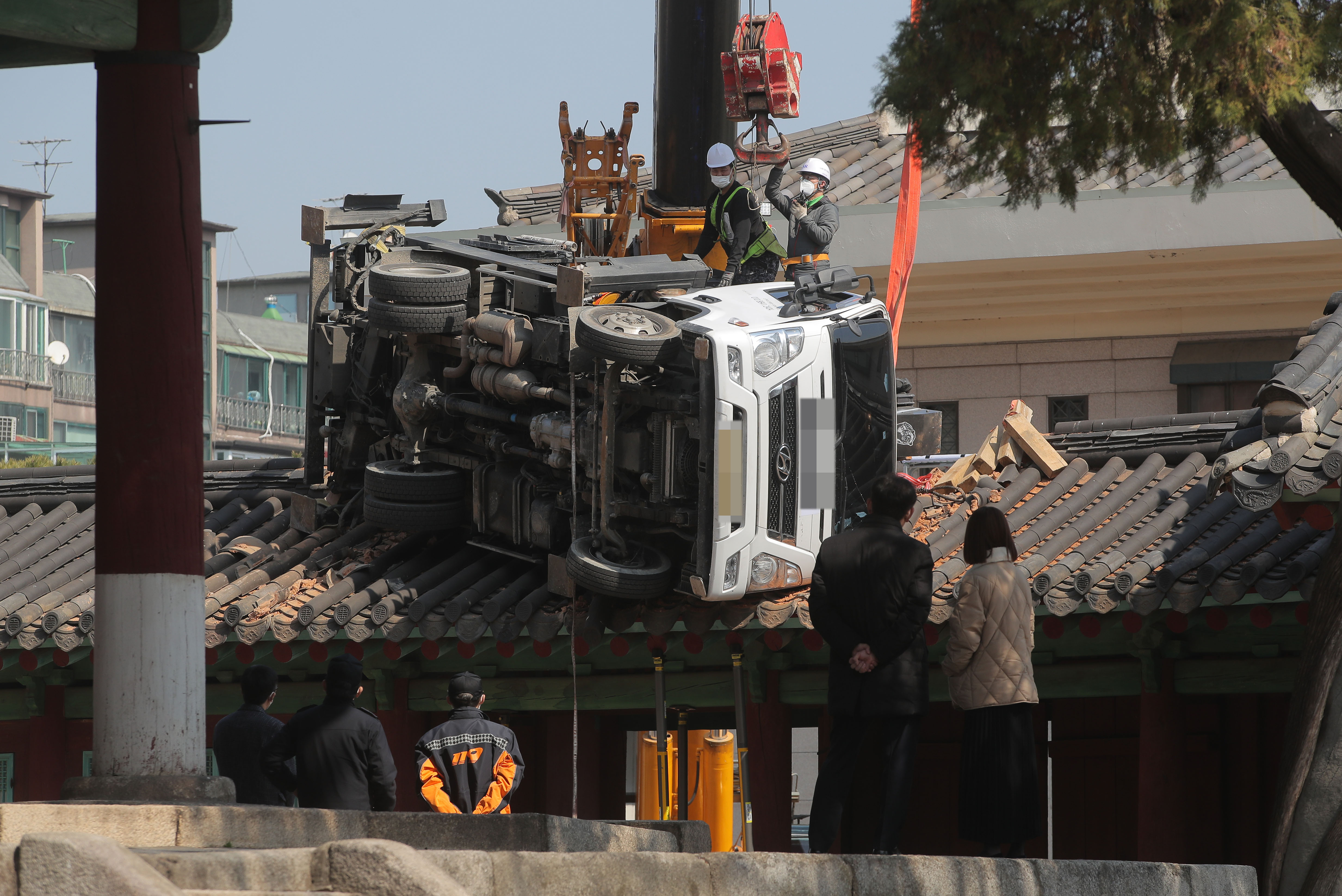 Seoul, March 8th (Yonhap) -- A part of the Seonggyungwan Munmyo Confucian Shrine located in the district of Jongno-gu, Seoul has been damaged. On Monday at 9:21 a.m., a 9-ton ladder truck was seen fal ...