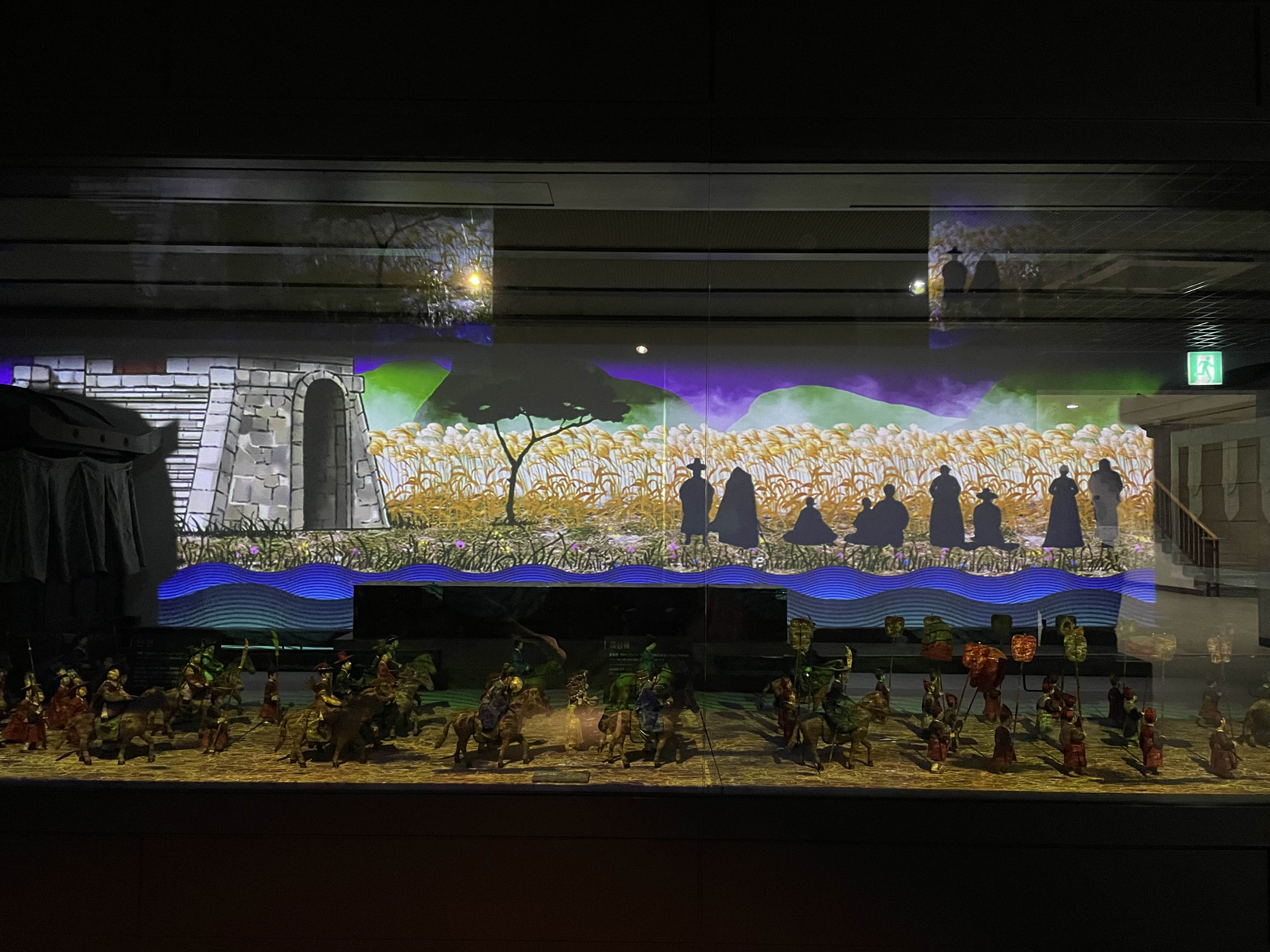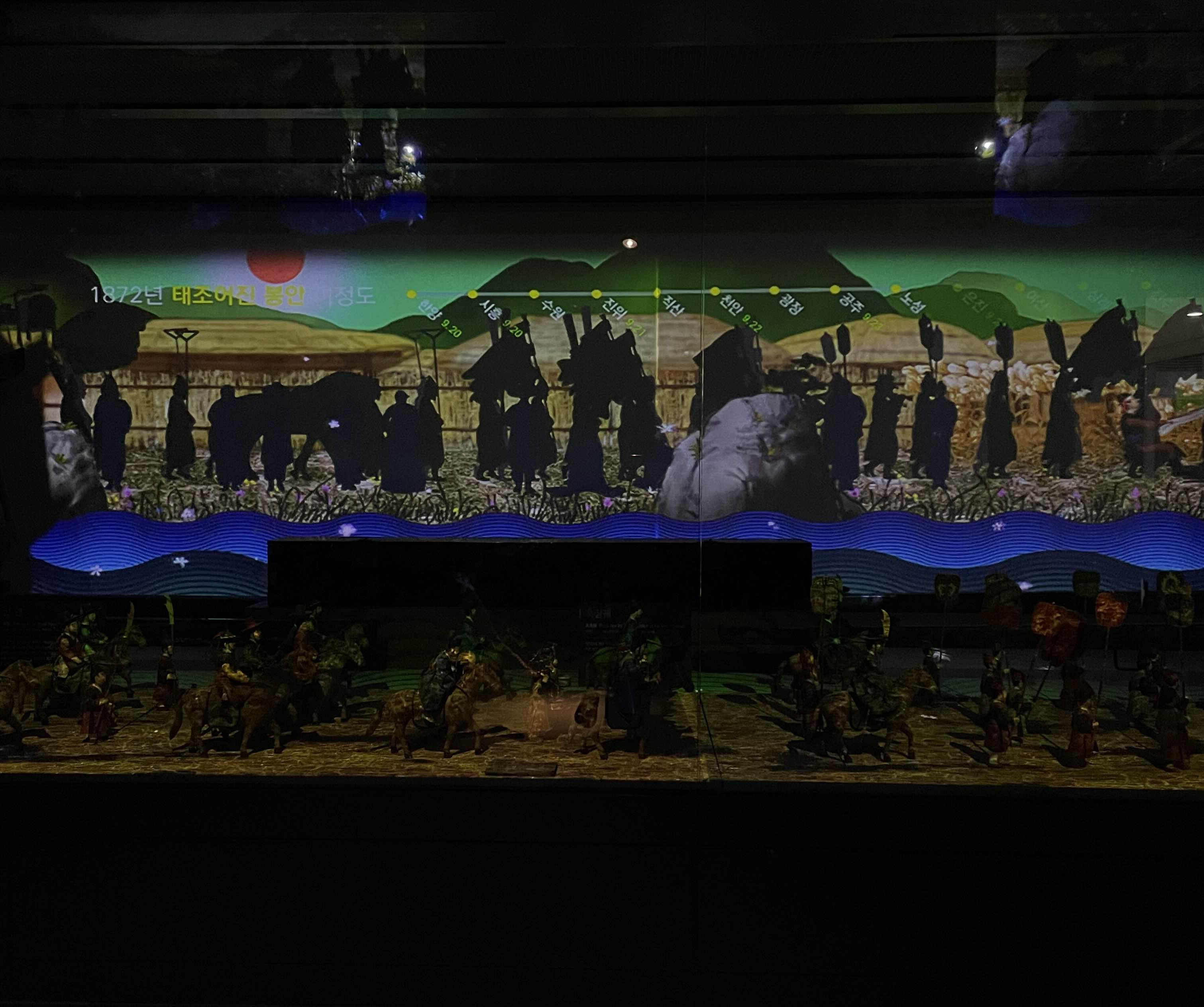 원 디오라마는 어진행차를 담은 모습이었는데, 여기에 스토리가 있는 영상을 맵핑하여 죽어있는 디오라마가 살아있게 느껴졌습니다. 내용은 어진이 전주까지 오는 과정을 담았습니다.