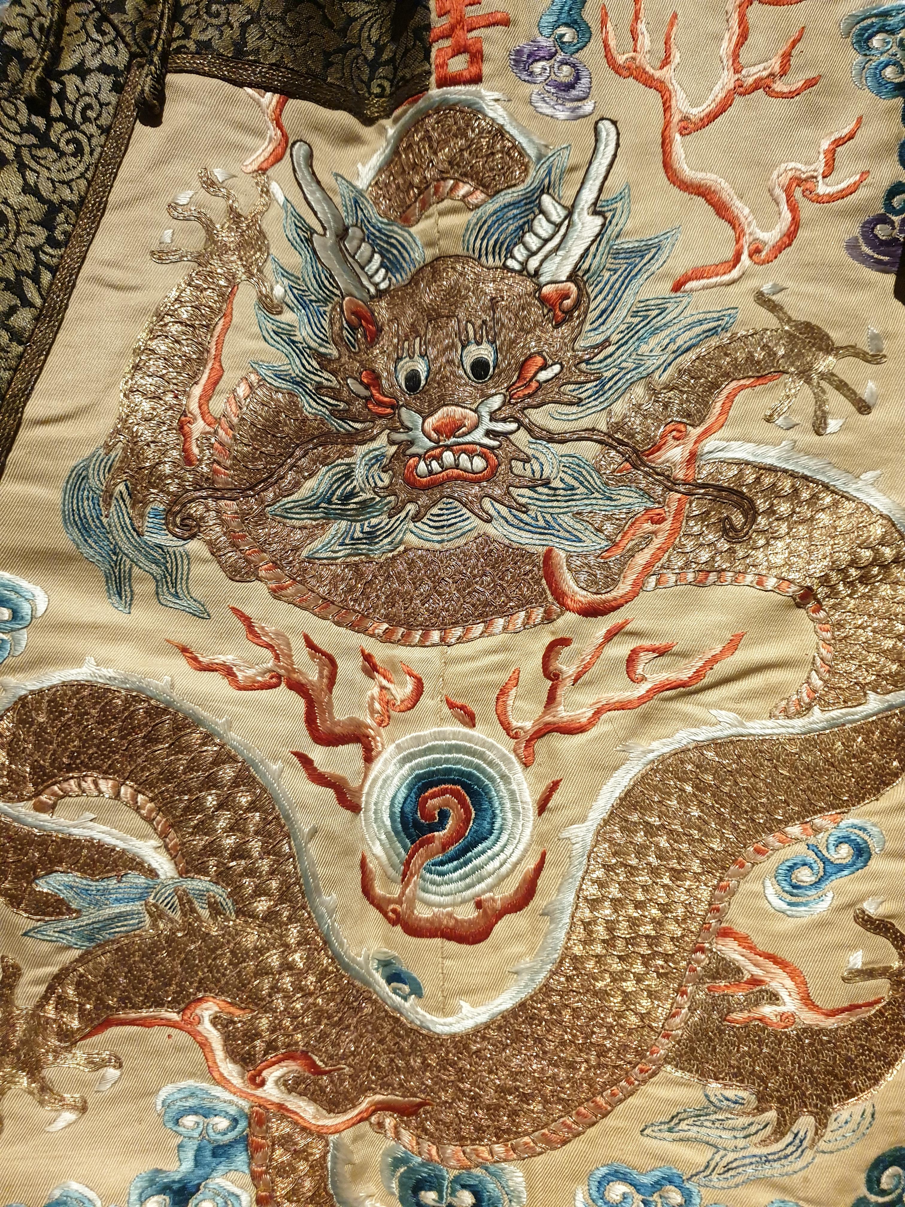 살피면 용이 한 마리가 아니다. 온통 누른 바탕에다가 열라 많은 용을 자수로 표현했다.