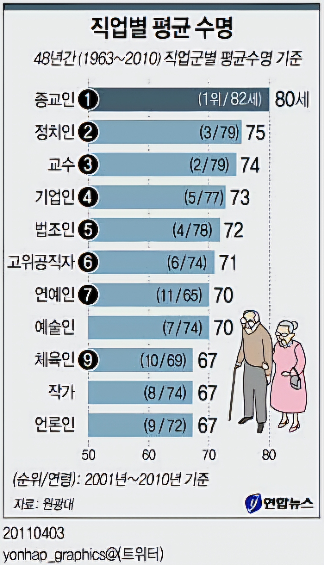 십년이 더 지난 통계라 지금은 또 수치와 순위 변동이 있겠지만 직업군 평균수명이라