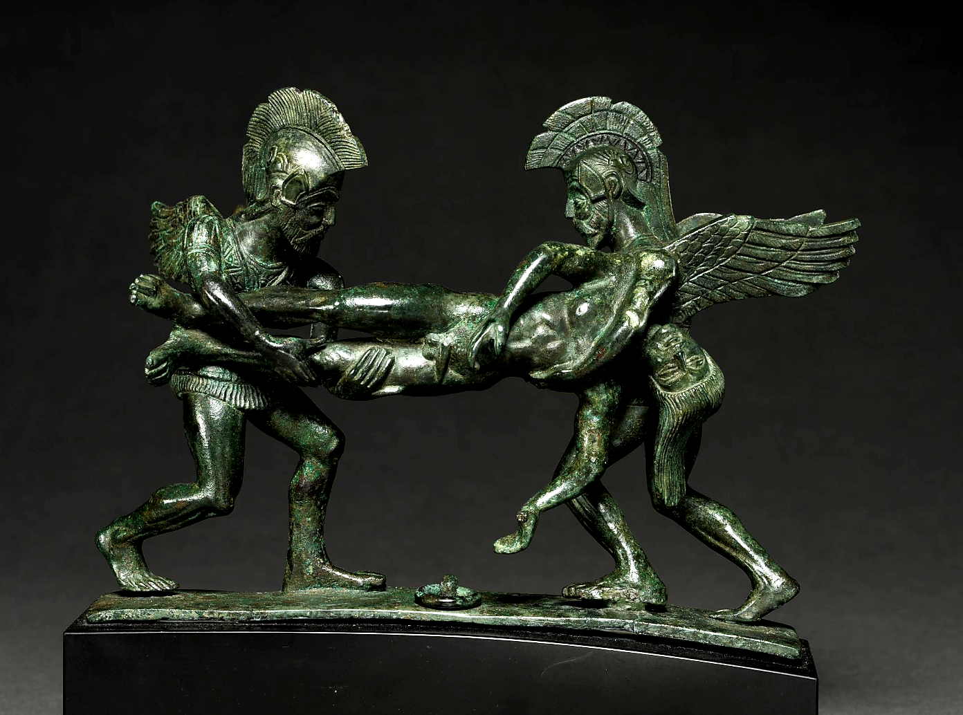 잠의 신 히프노스 Hypnos 와 죽음의 신 타나토스 Thanatos 가 트로이 전장에서 죽은 제우스의 아들 "화석 투구를 쓴 신과 같은 사르페돈"의 살해된 시신을 운반하는 모습을 형상화했다고 해석하곤 한댄다.