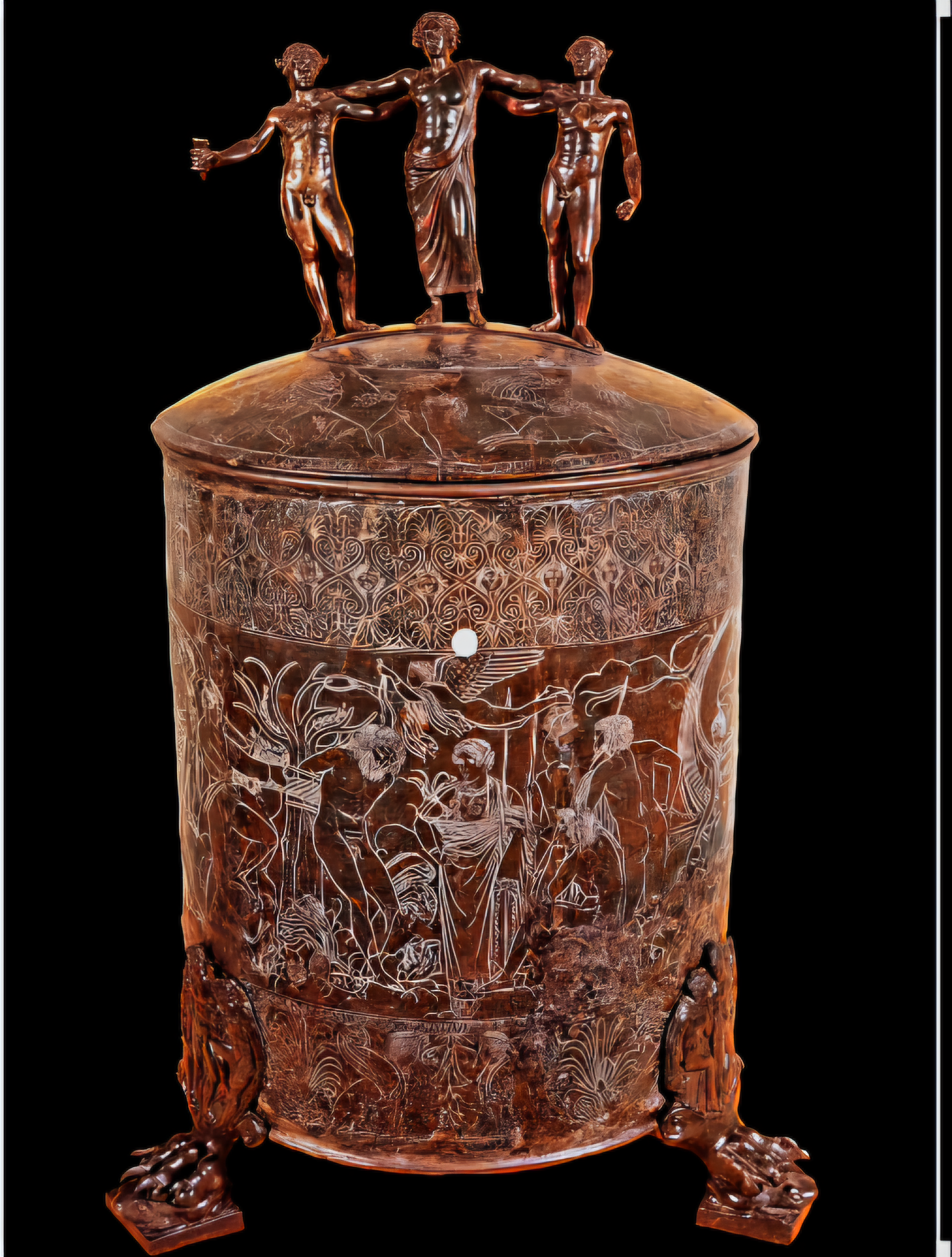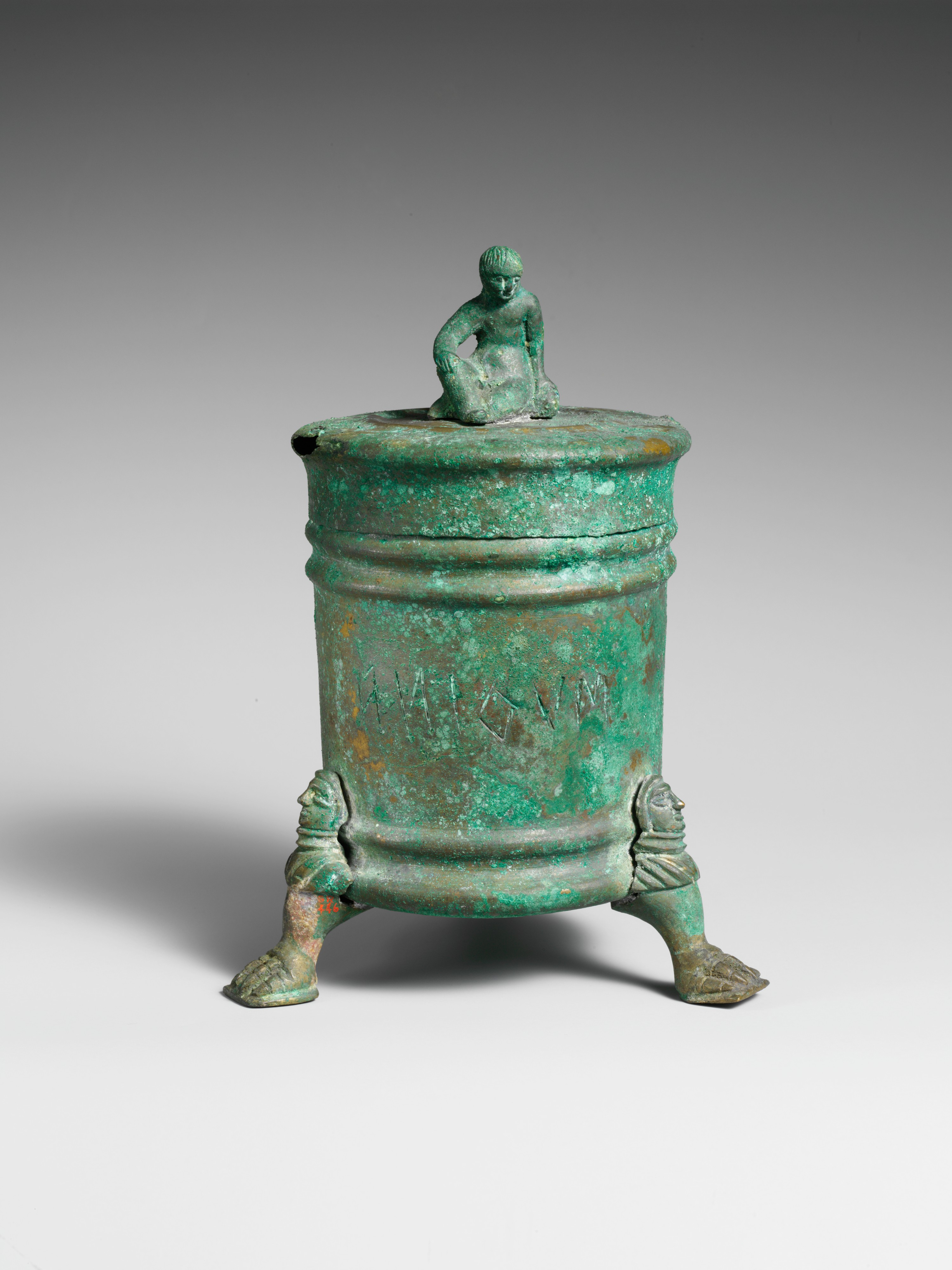 로마가 등장하기 이전 이탈리아 반도 주인 노릇을 한 에트루리아 Etruria 시대 그네가 남긴 유산 중 하나로 미국 클리블랜드미술관 소장품인 이것은 청동 시스타 bronze cista, 곧 원통형 보석함 손잡이라 하는데 제작시기는 대략 기원전 400-380년 무렵으로 본다 한다.