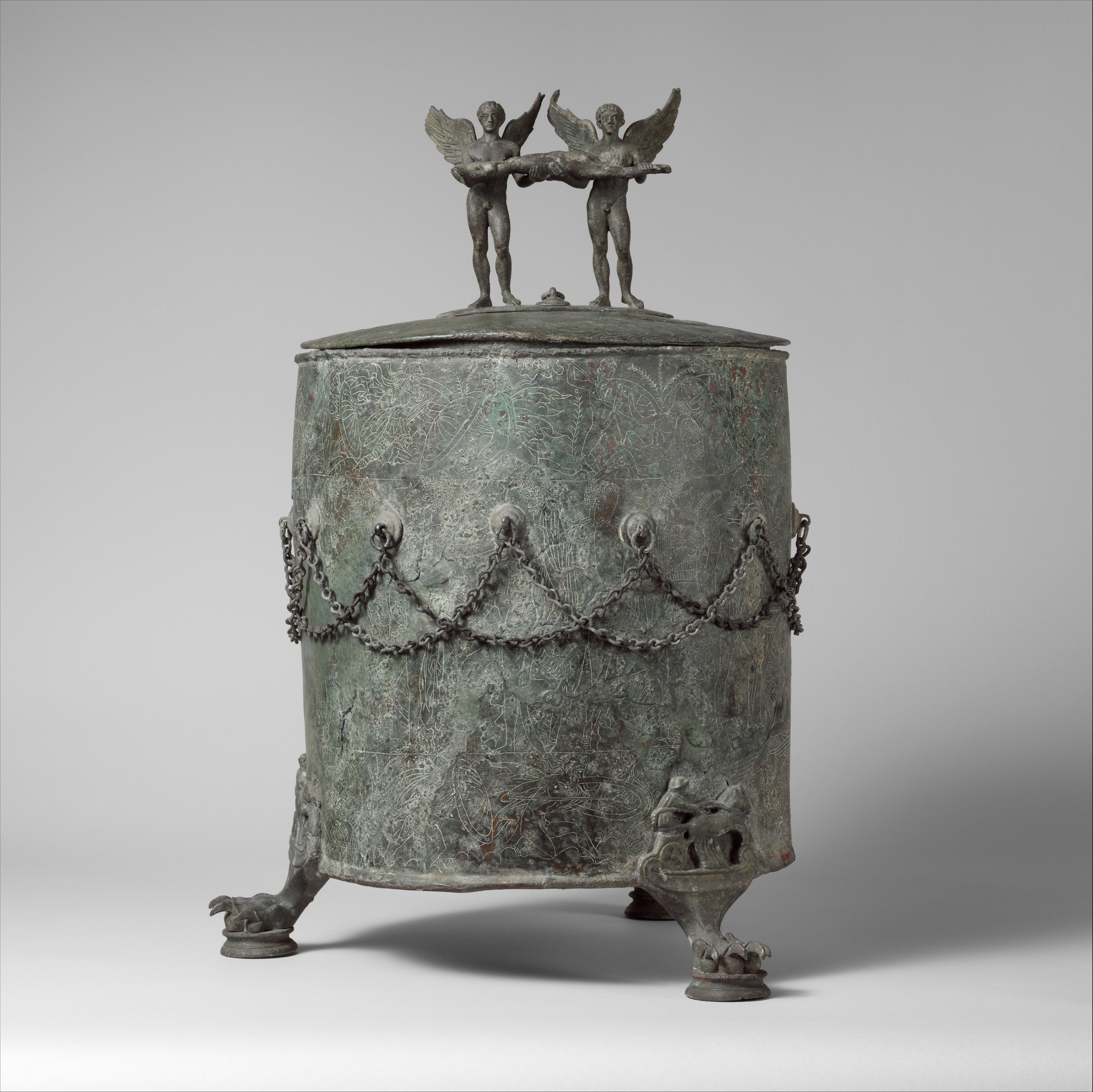 This is the largest and finest of the Museum's engraved cistae. The cylindrical body is decorated with three friezes, an unusual treatment. On the major frieze is a series of episodes from the Trojan War told in Homer's Iliad, including what seems to be the sacrifice of the Trojan prisoners. The minor friezes, above and below, depict battle scenes and chariot races but also include unrelated subjects, for example griffins attacking a horse. The chariot race continues on the solid-cast lion-paw feet. The poorly preserved engravings on the lid probably depict winged nereids riding on dolphins and sea monsters while carrying the armor of Achilles, the major Greek hero of the Trojan War. The handle, one of the finest of this type, shows two nude winged genii carrying the body of a dead soldier. The treatment of wing feathers and hair is especially delicate.
