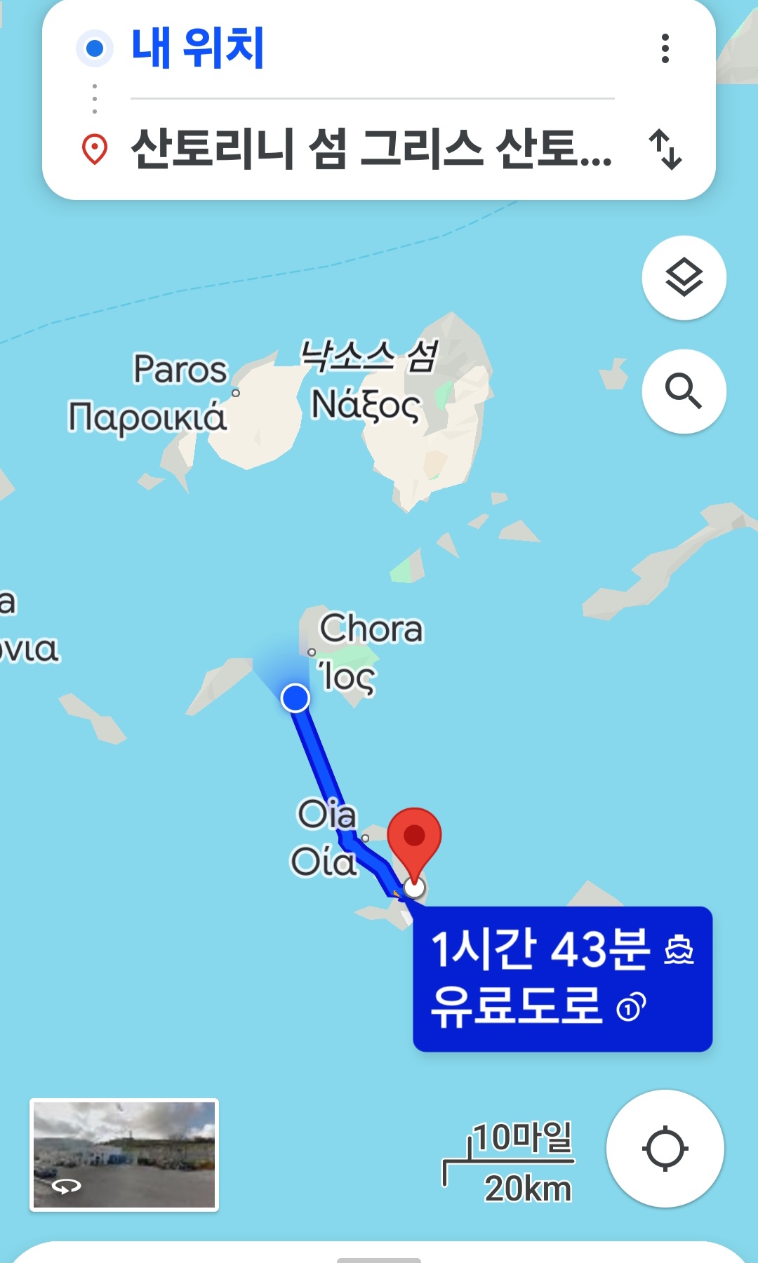 내가 위치한 지점과 목적지 산토리니 항로를 제공한다.
