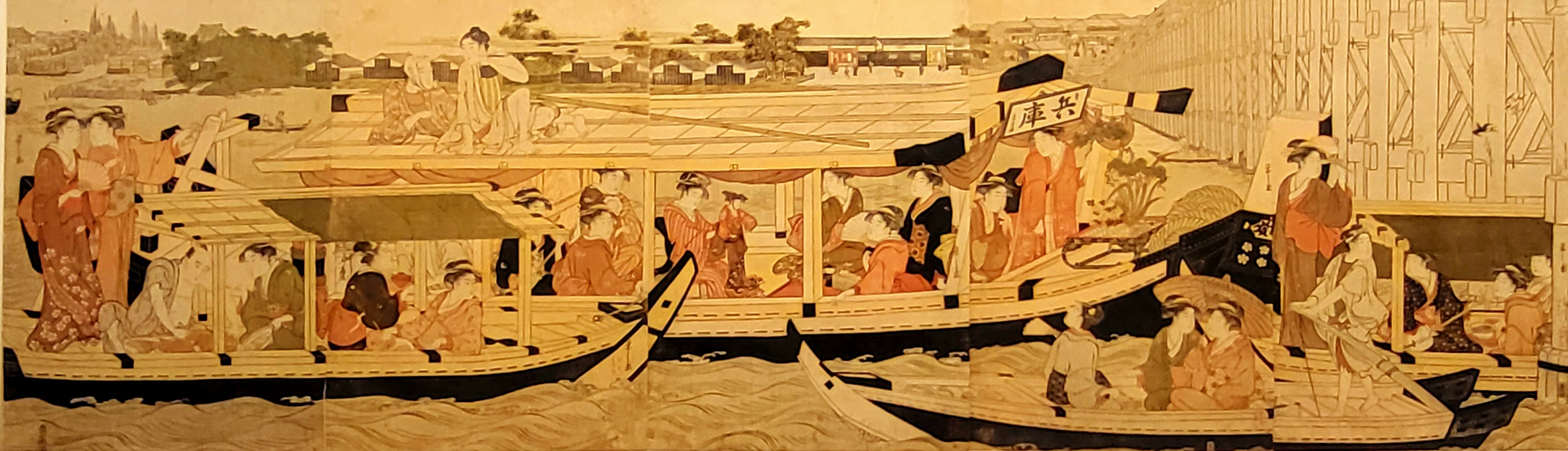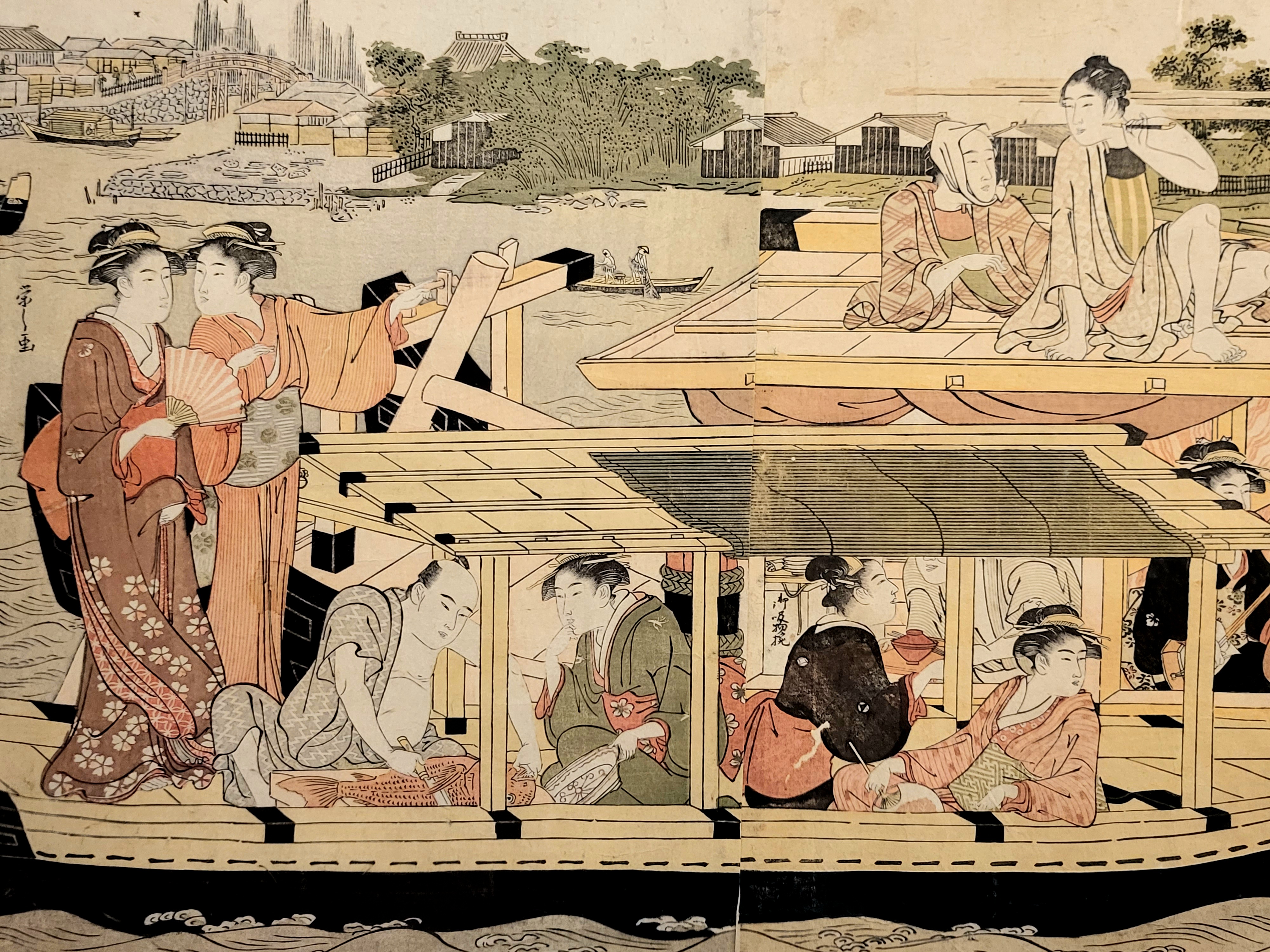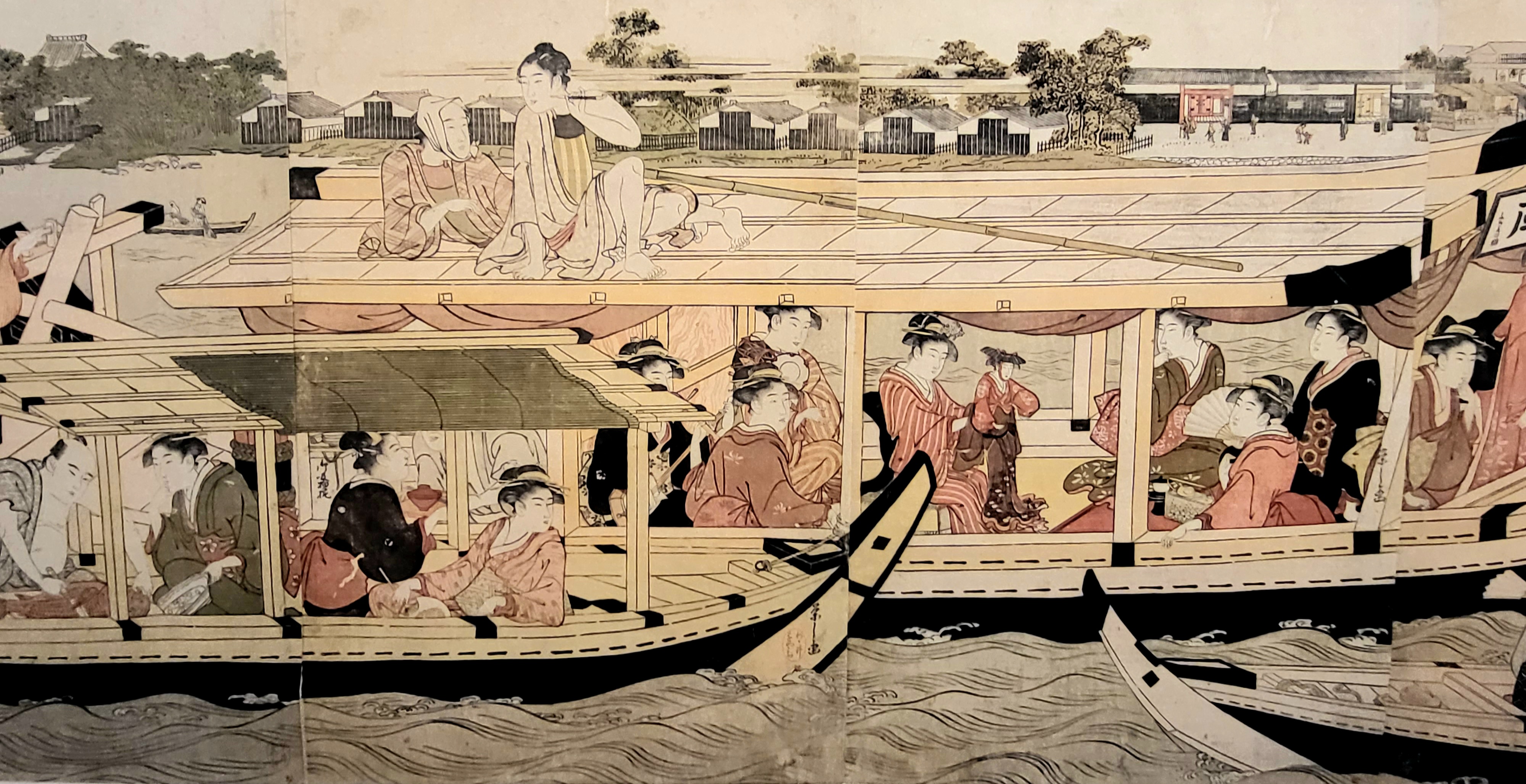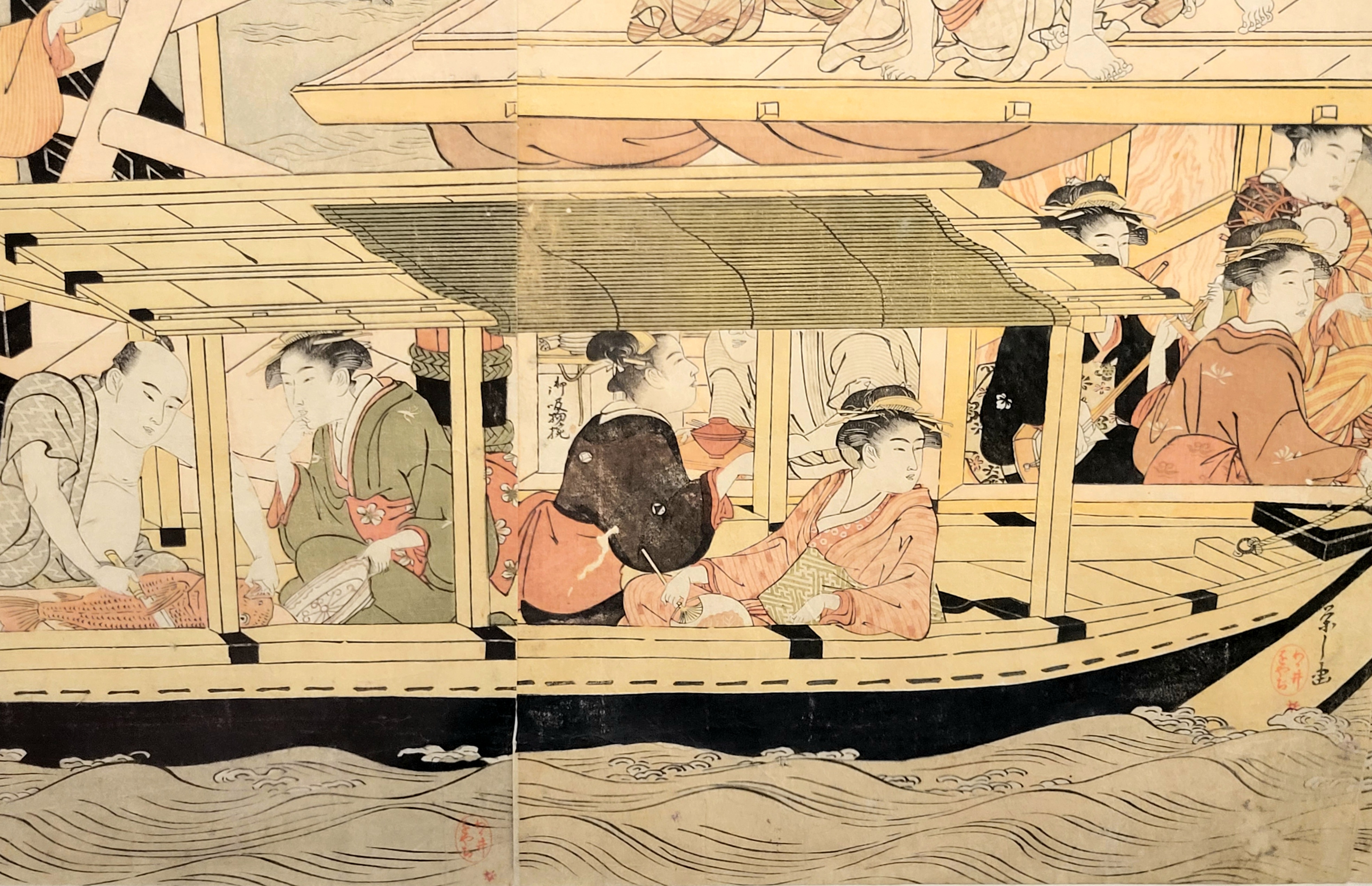 (屋形船, 지붕 있는 배)에서는 인형극이 공연 중이고, 왼쪽 배에서는 도미가 요리되고 있다.