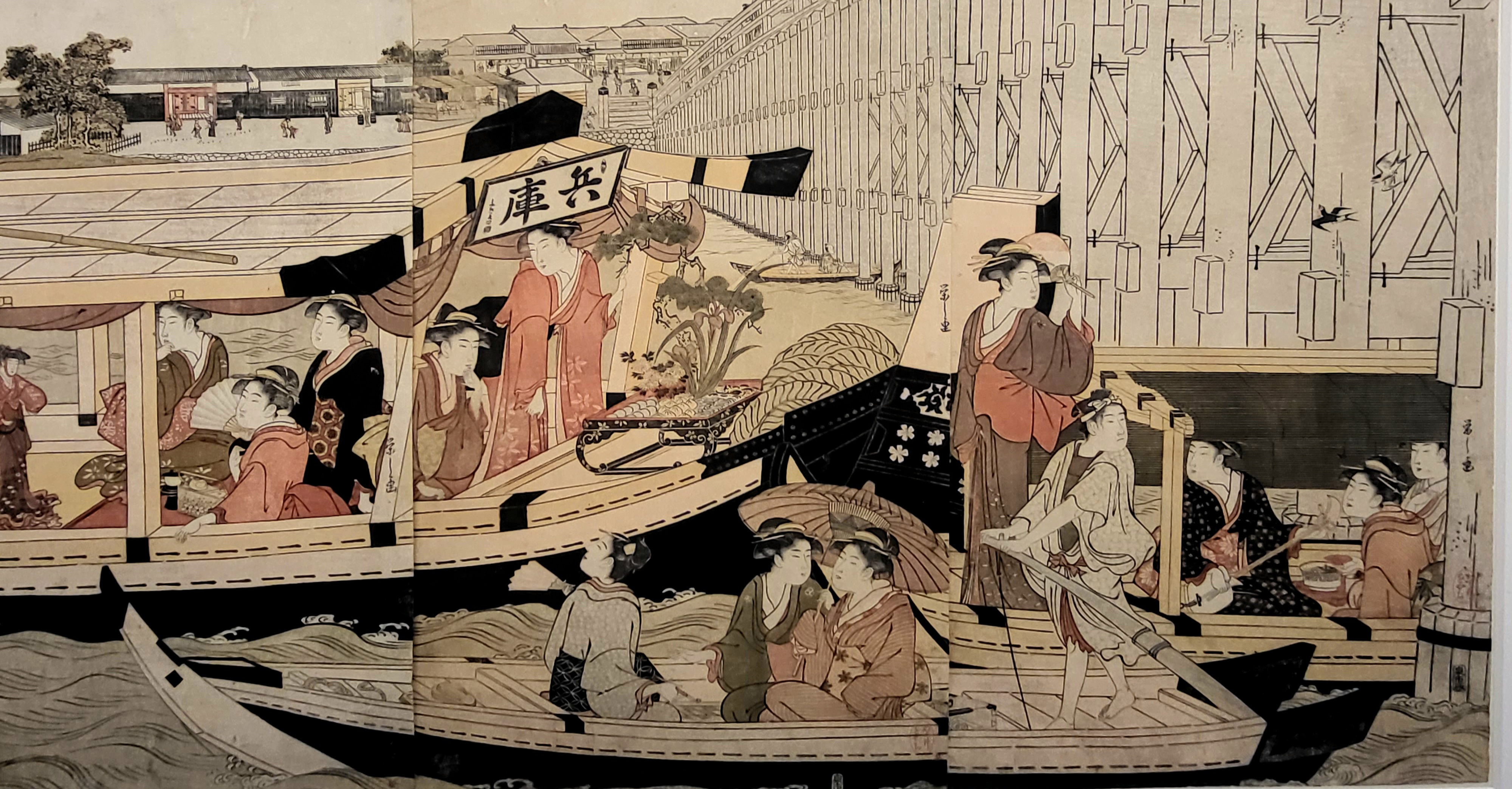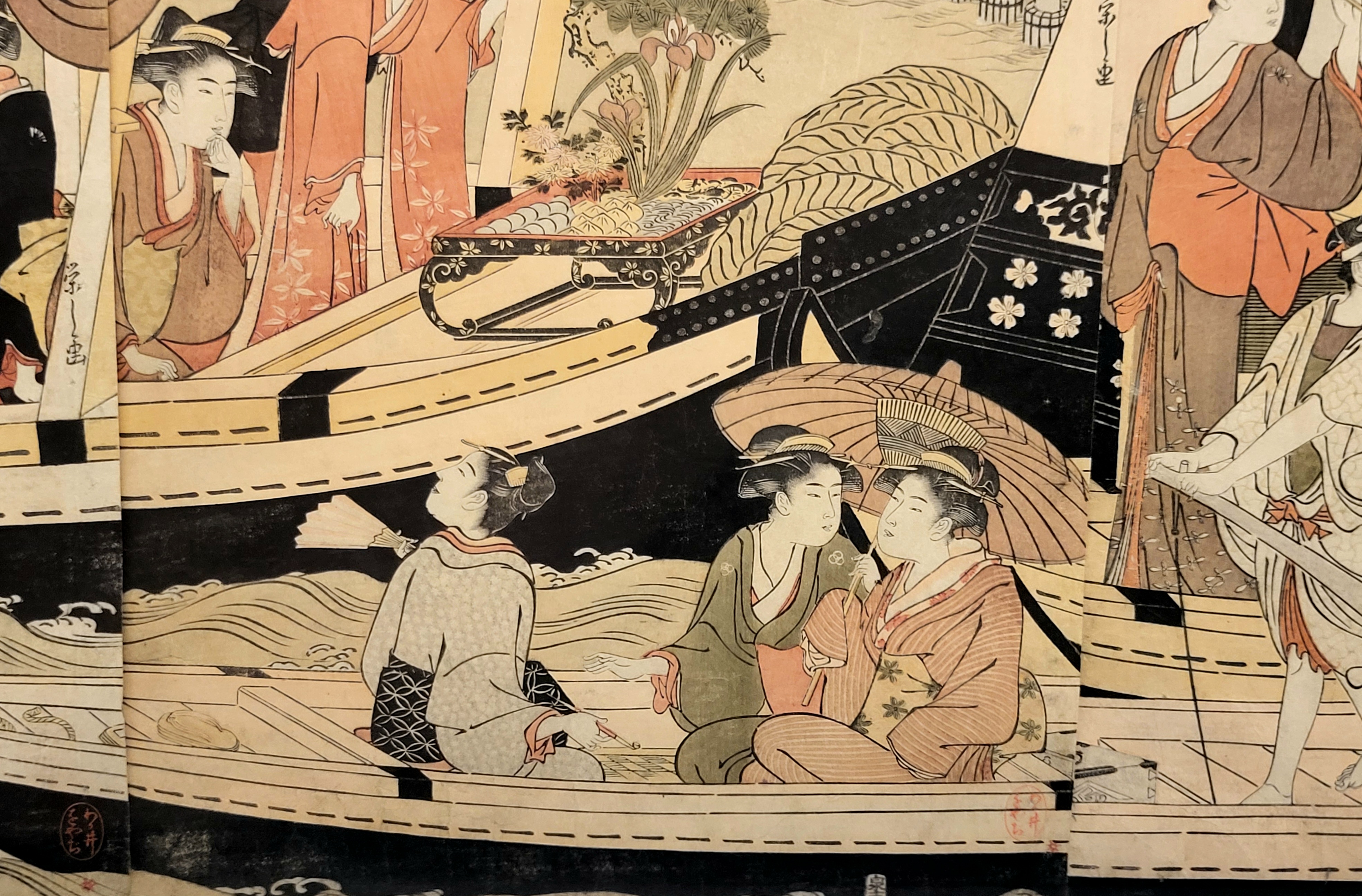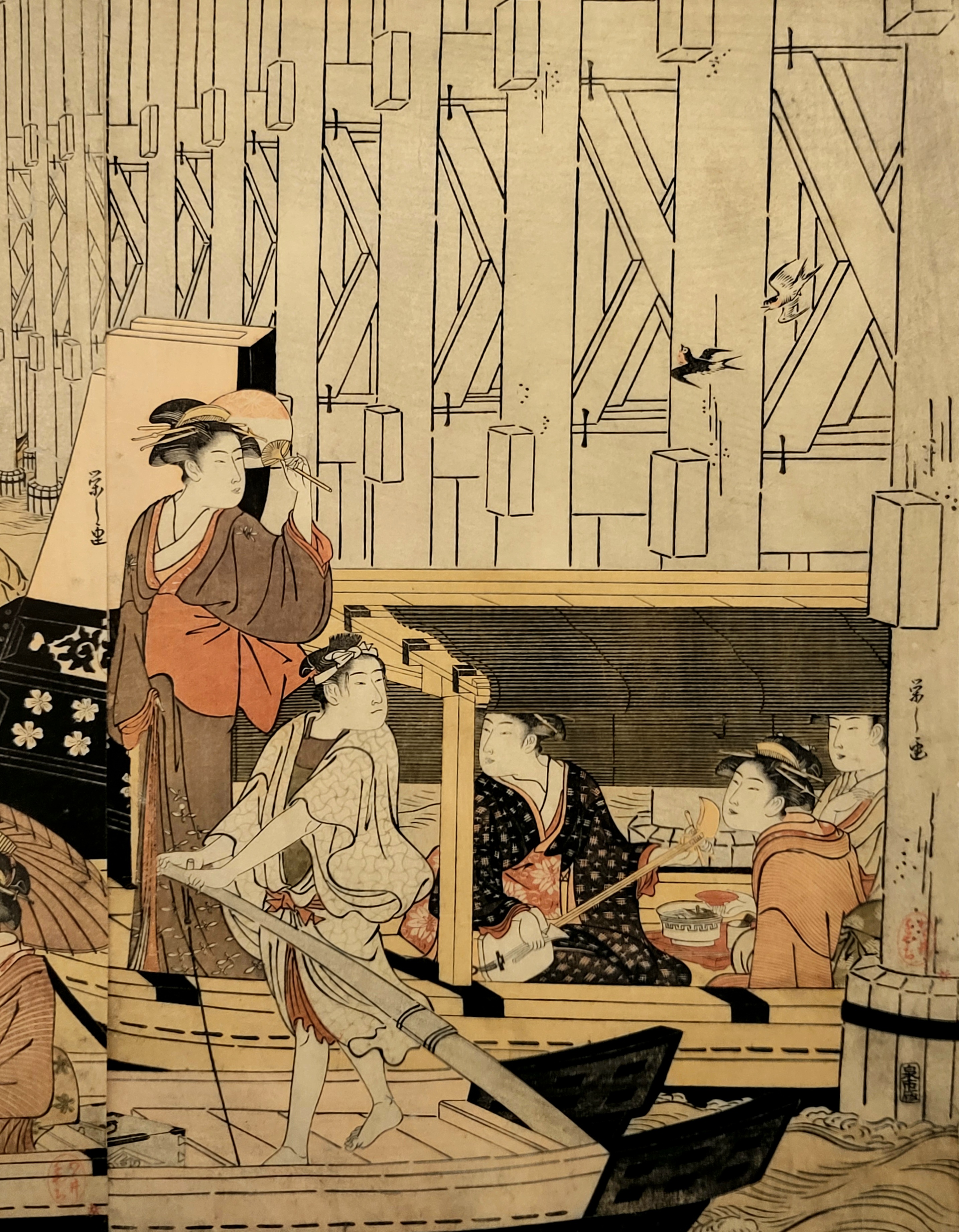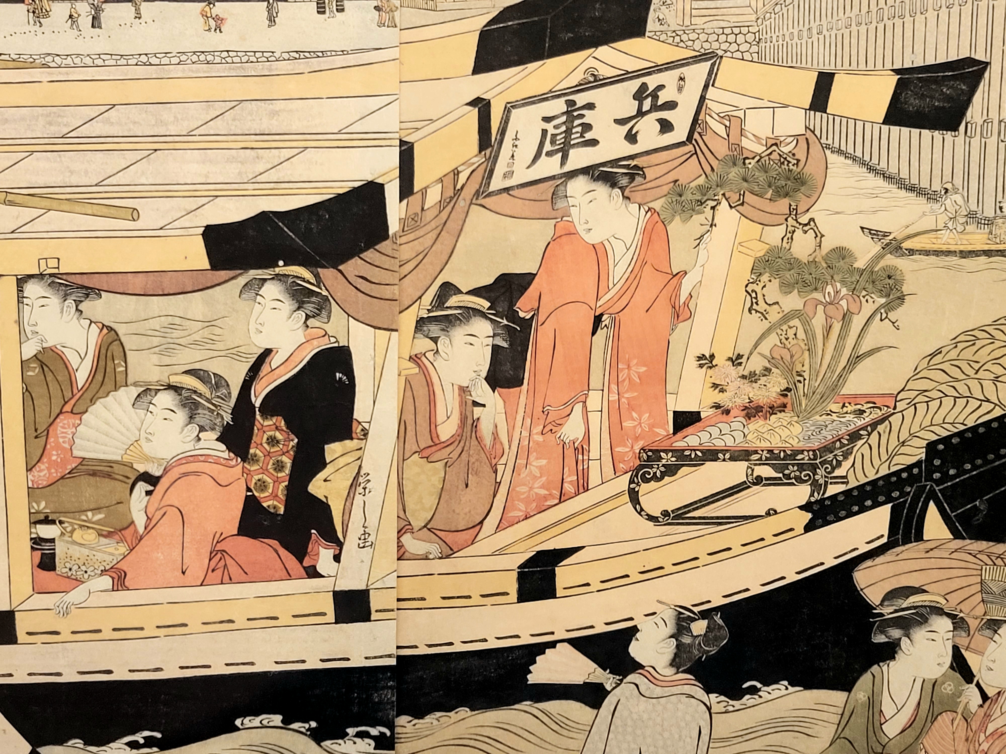(屋形船, 지붕 있는 배)에서는 인형극이 공연 중이고, 왼쪽 배에서는 도미가 요리되고 있다.