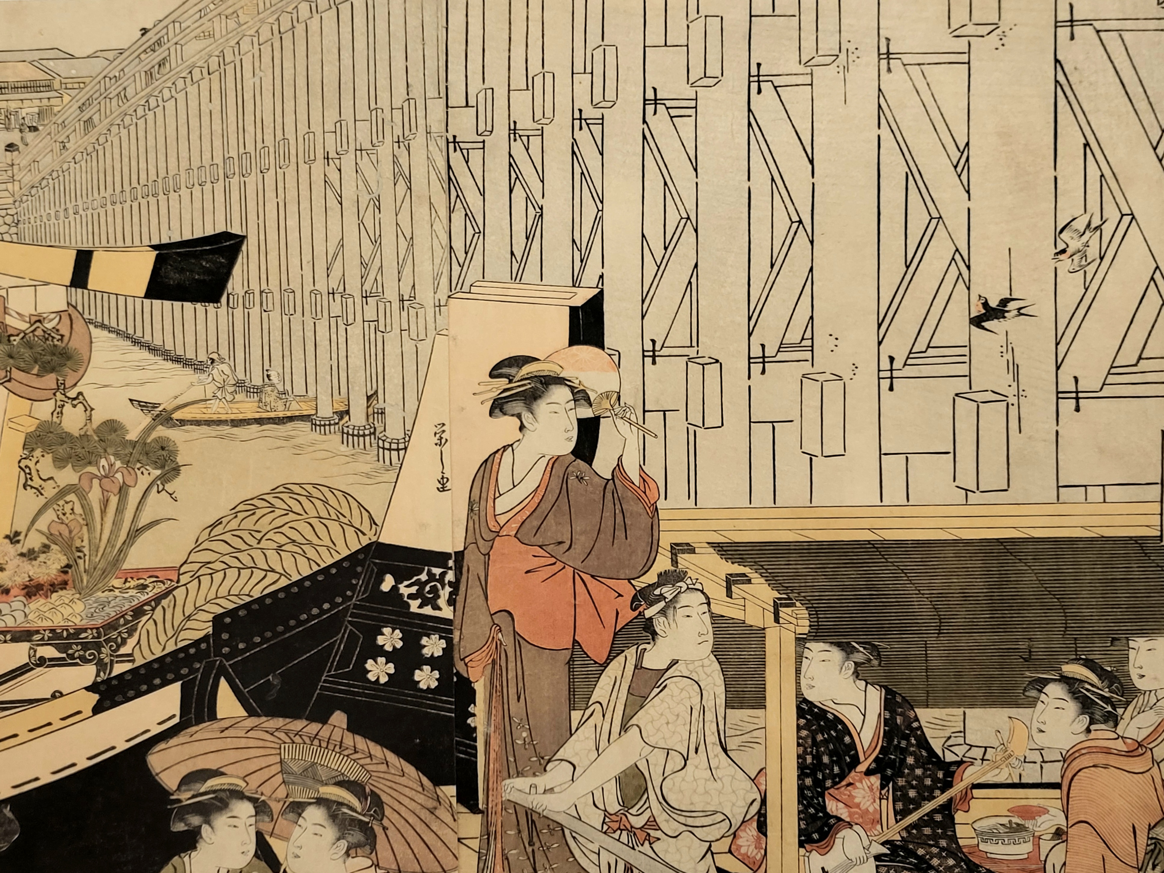 (屋形船, 지붕 있는 배)에서는 인형극이 공연 중이고, 왼쪽 배에서는 도미가 요리되고 있다.
