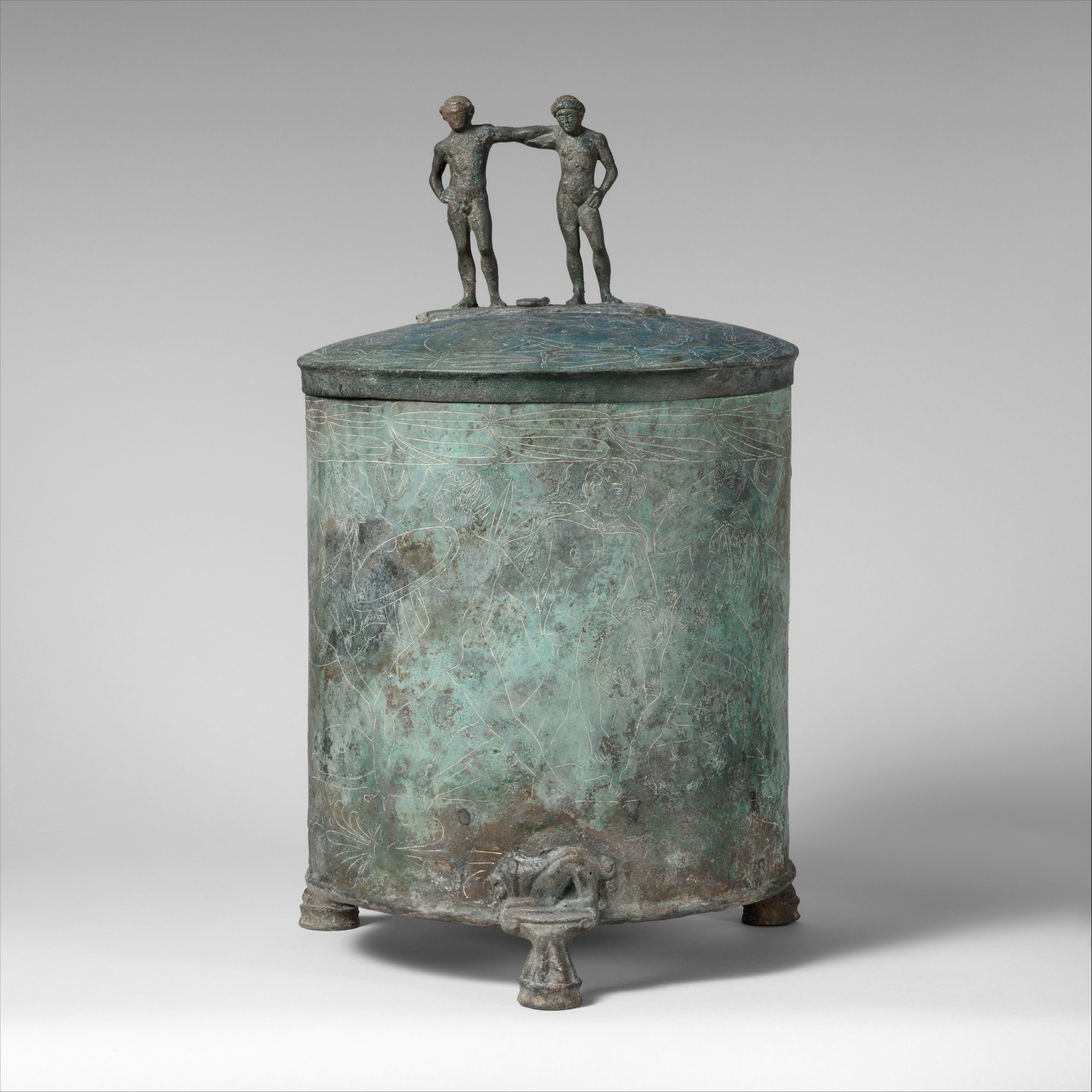 This is the largest and finest of the Museum's engraved cistae. The cylindrical body is decorated with three friezes, an unusual treatment. On the major frieze is a series of episodes from the Trojan War told in Homer's Iliad, including what seems to be the sacrifice of the Trojan prisoners. The minor friezes, above and below, depict battle scenes and chariot races but also include unrelated subjects, for example griffins attacking a horse. The chariot race continues on the solid-cast lion-paw feet. The poorly preserved engravings on the lid probably depict winged nereids riding on dolphins and sea monsters while carrying the armor of Achilles, the major Greek hero of the Trojan War. The handle, one of the finest of this type, shows two nude winged genii carrying the body of a dead soldier. The treatment of wing feathers and hair is especially delicate.