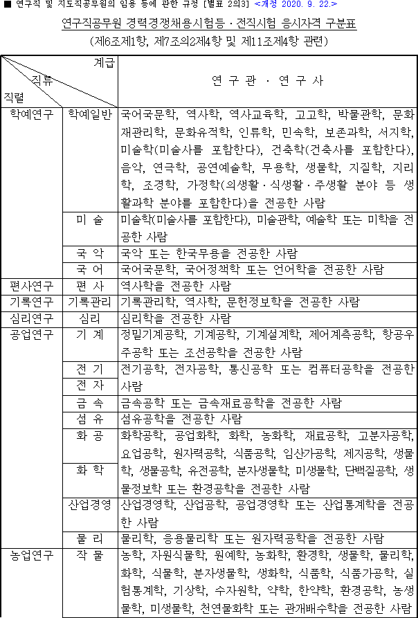 이 구분표를 보면 학예연구 직렬뿐만 아니라, 편사연구, 기록연구, 심리연구, 공업연구, 농업연구 등 연구직 전체 직렬의 응시자격(전공)이 나와 있다.
