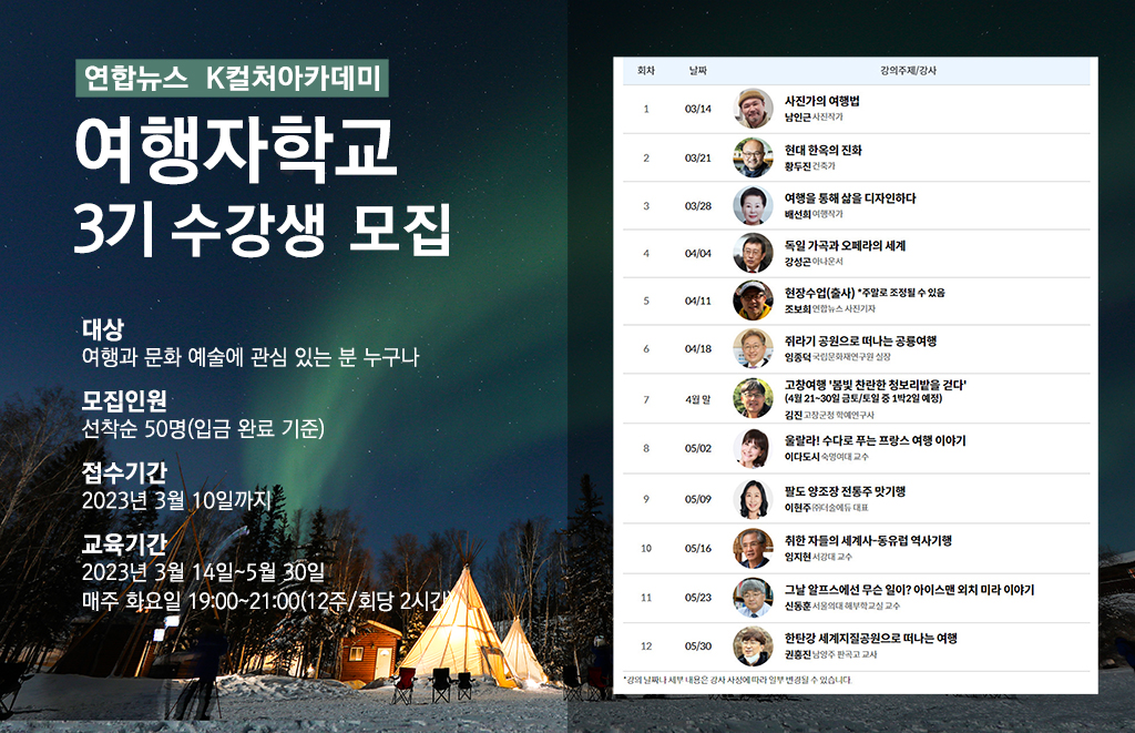 (서울=연합뉴스) 나확진 기자 = 연합뉴스 K컬처아카데미가 '여행자학교' 3기 강좌를 마련, 수강생을 모집한다고 13일 밝혔다.