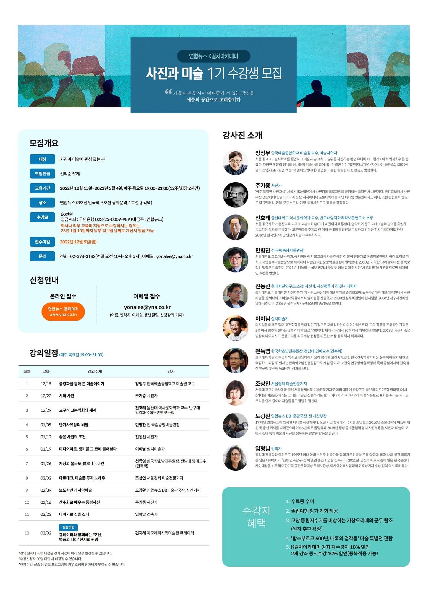 “연합뉴스 K컬쳐 아카데미”는 2023년 3월 2일까지 총 12회입니다. 강의진들은 관련 분야의 내로라 하는 전문가들로 구성되어 있는 고퀄리티 아카데미 입니다.