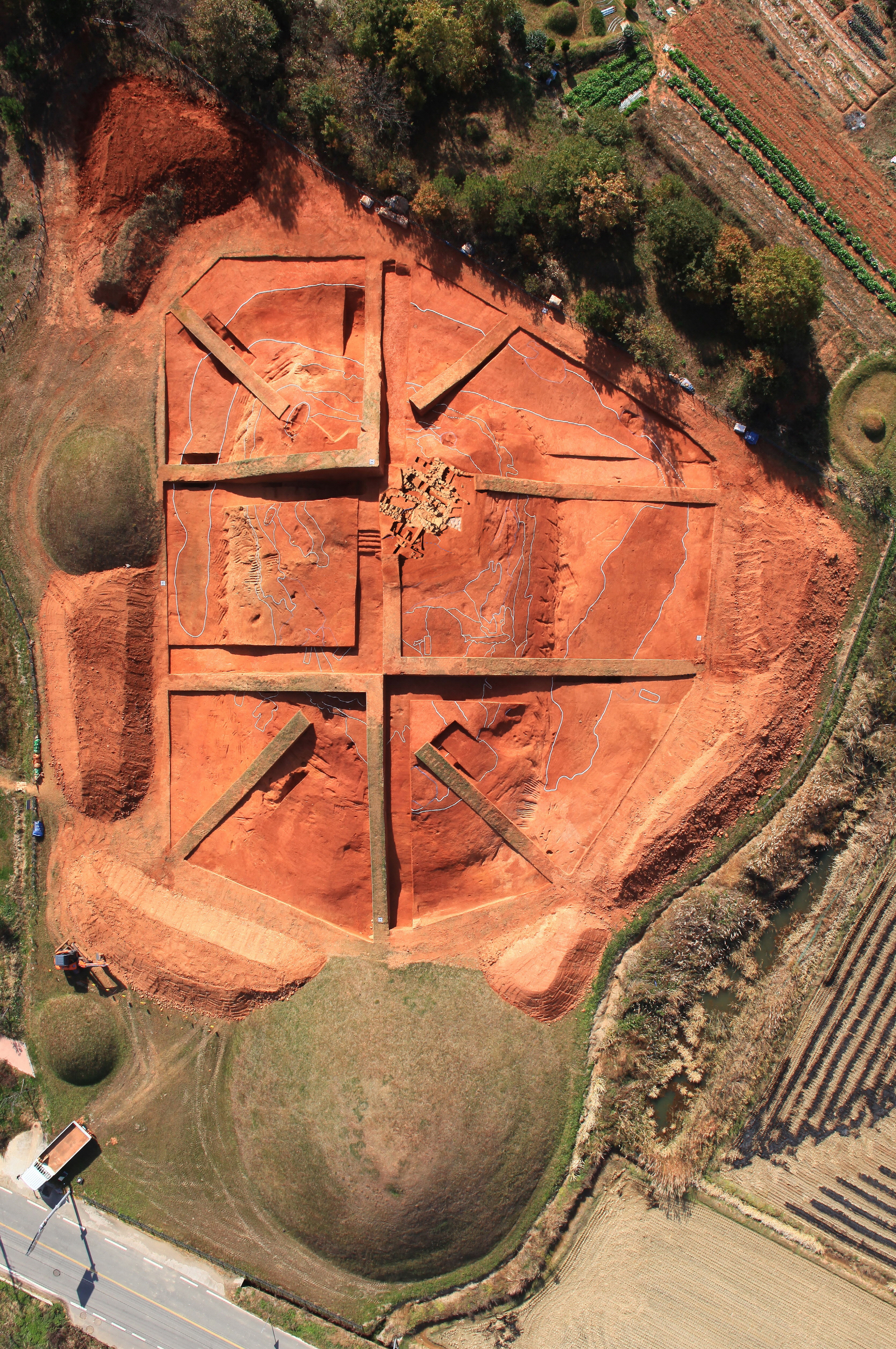보도자료에서는 쌍분이라 설명했지만, 우리가 언뜻 생각하는 황남대총을 필두로 하는 경주지역 이른바 표형분과는 양상이 전연 달라, 연접한 상태이기는 하지만 두 고분이 별도 연결 봉토 없이 각기 다른 봉분을 형성한다는 점이어니와, 이를 각각 1호분과 2호분으로 명명했다 하거니와, 현재 조사중인 것은 1호분이다.