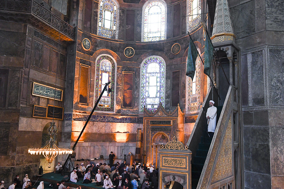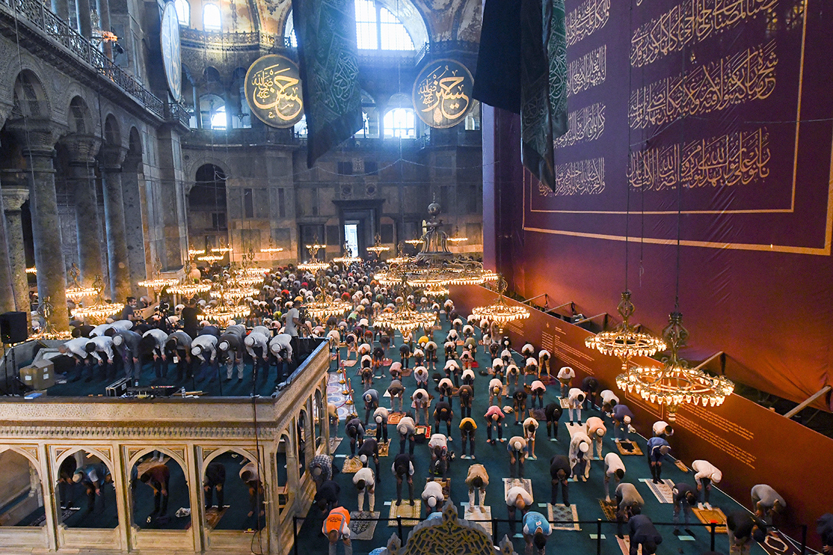무슬림들은 성화와 모자이크를 천으로 가리고 바닥에 녹색 카펫을 깐 성소피아 내부에 모여 앉아 예배에 참여했다.