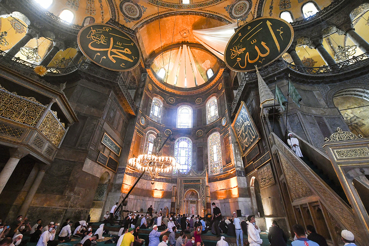 무슬림들은 성화와 모자이크를 천으로 가리고 바닥에 녹색 카펫을 깐 성소피아 내부에 모여 앉아 예배에 참여했다.