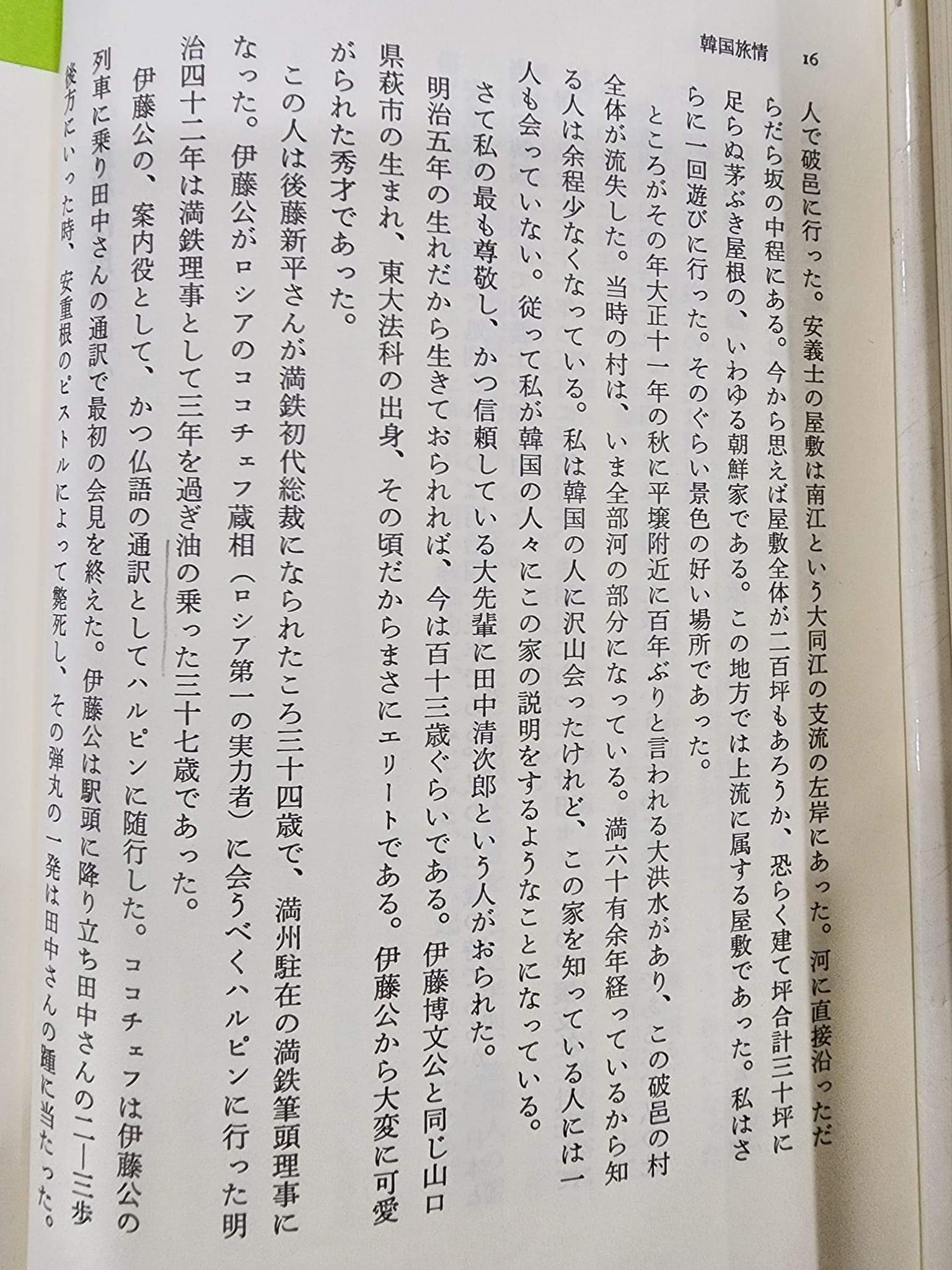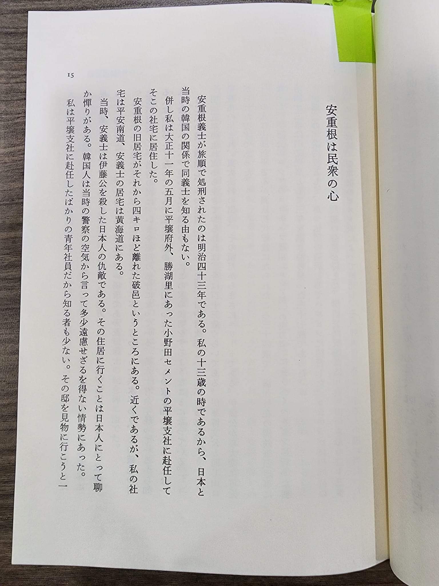 이런 그가 훗날 펴낸 회고록 『韓國わが心の故里(한국, 내 마음의 고향)』(原書房, 1984)의 ‘安重根は民衆の心(안중근은 민중의 마음)’이라는 챕터에는 안중근 의사가 하얼빈역에서 이토 히로부미를 저격했을 당시 이토를 수행하다가 함께 총상을 입은 남만철도 이사 다나카 세이지로(田中淸次郞)가 “내가 만난 사람 중 가장 훌륭한 사람은 안중근”이라고 말한 내용이 나온다.
