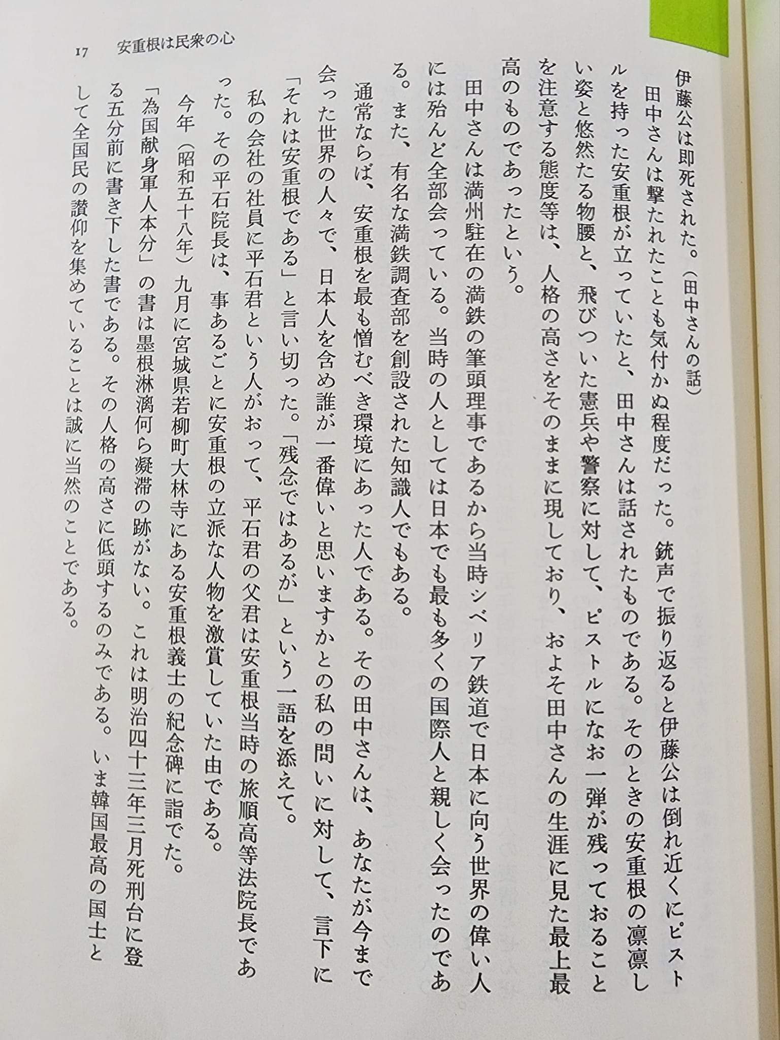 “당신이 이제까지 만난 세계의 여러 사람 중 일본인을 포함해 누가 가장 훌륭하다고 생각하느냐”라는 (안도의) 질문에 “그(다나카)는 한마디로 ‘그것은 안중근 이다’라고 말했다. 유감이지만... ”