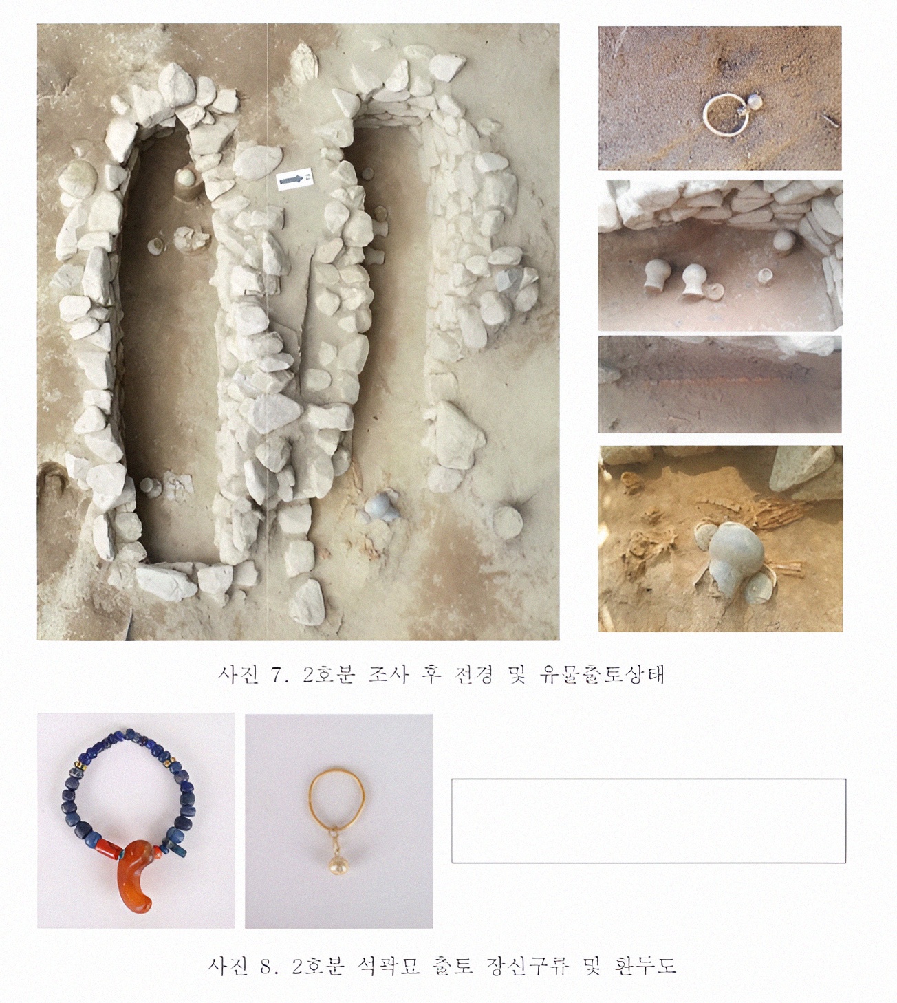 2-1호 석곽묘라고 명명한 지점에서는 완형 금제 귀걸이가 나왔고, 즈 주변에서 목걸이로 추정하는 곡옥과 채색옥들이 출토되었는가 하면, 남벽과 인접한 곳에서도 피장자 왼팔에 착용한 팔찌로 추정되는 소옥류들이 수습됐다.