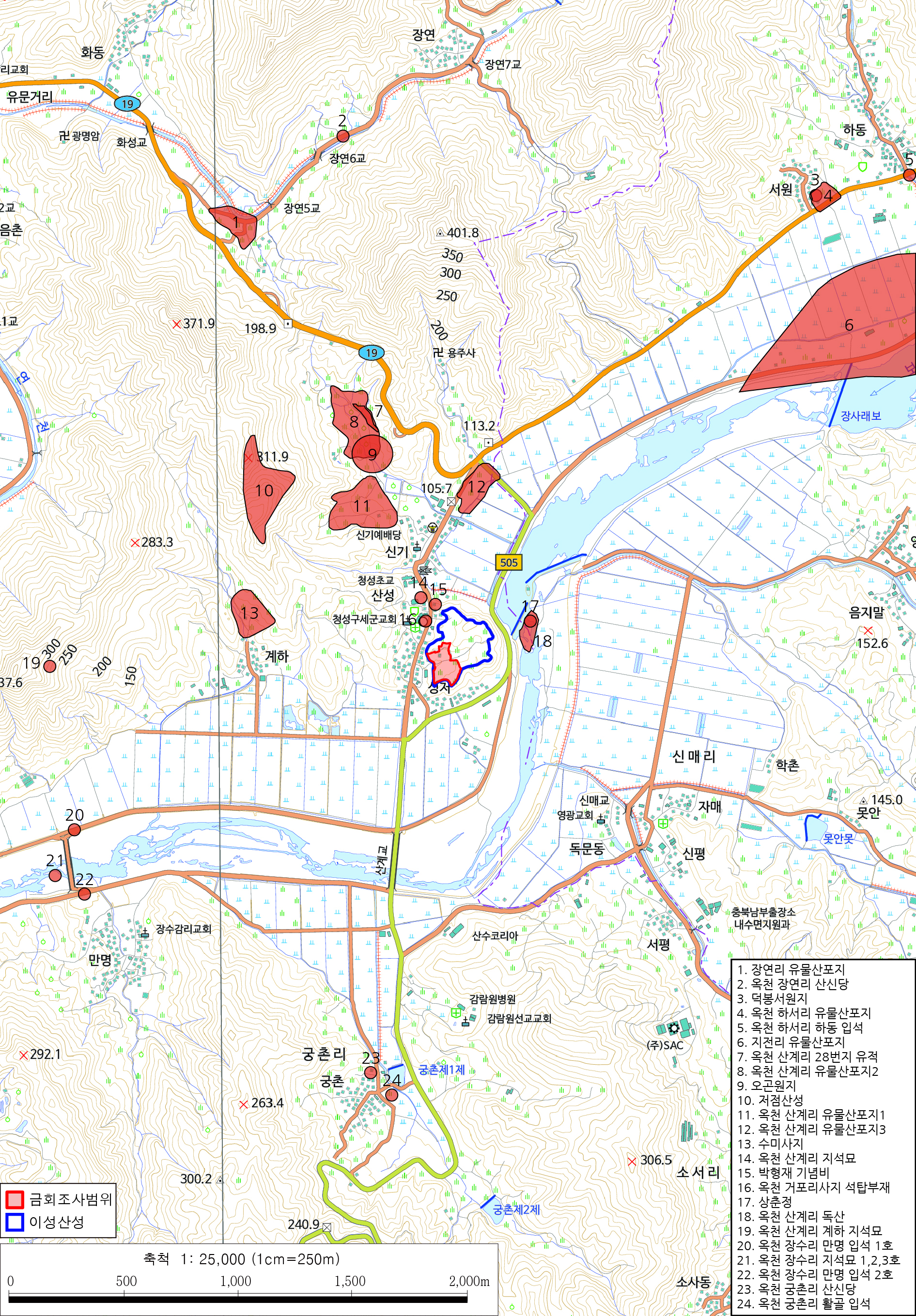 - 옥천 이성산성(기존 이름 옥천 산계리토성)의 현황 파악[성벽 둘레 1,140m / 면적 59,160㎡]