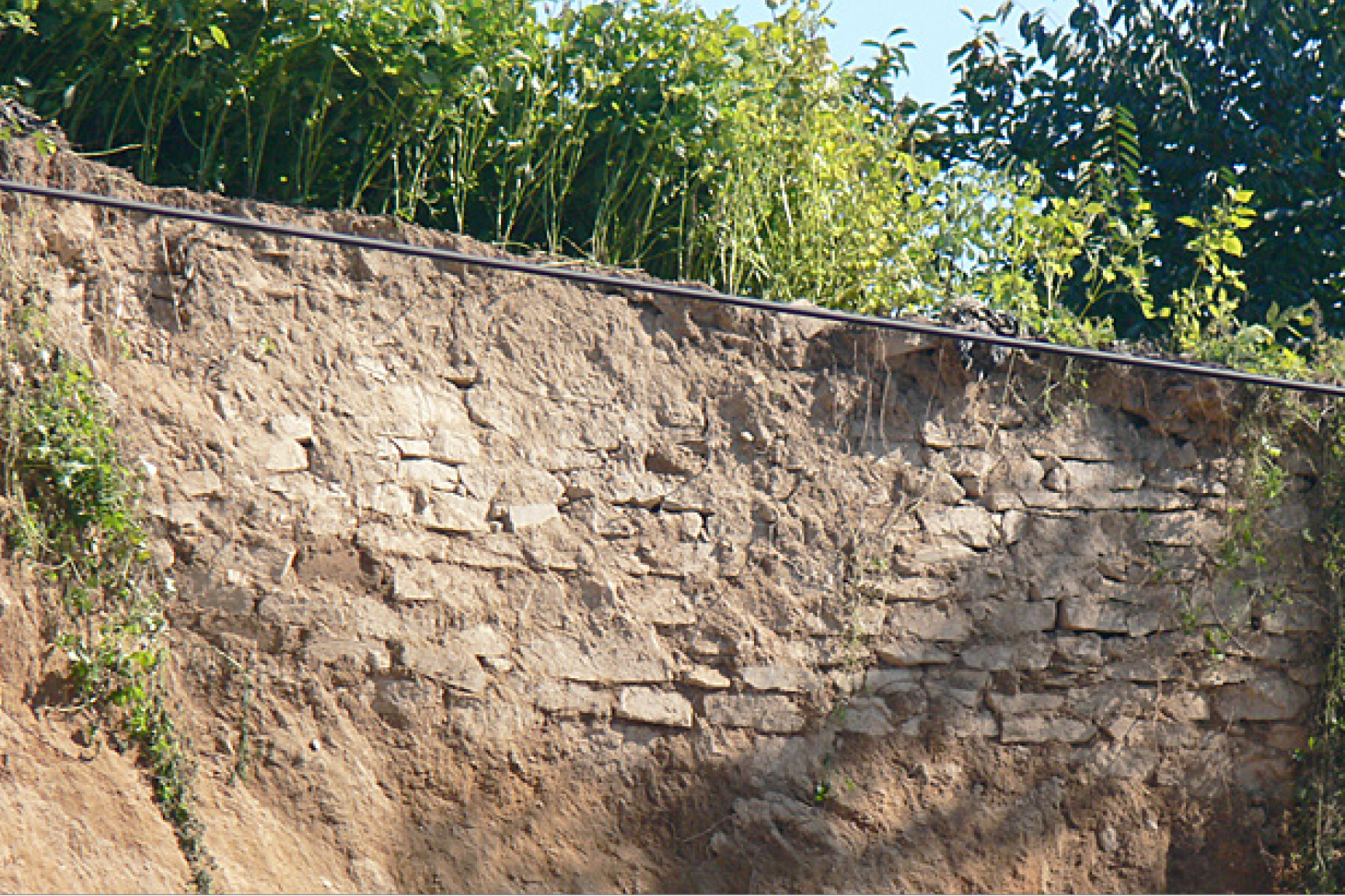 남쪽 성벽 지점을 일부 트렌치 조사한 결과 기반암을 성 바깥으로 계단을 이루도록 정지한 후 사질토와 점질토를 층층이 쌓아 올린 층위가 확인되었다. 표토 아래 약 2.0m 깊이에서 기반암이 확인되었고 이로부터 약 1.1m 높이까지는 성 외측 방향으로 약간 낮아지는 층위를 이루는데 반해, 그 위로는 수평에 가까운 층위가 조성되었다.