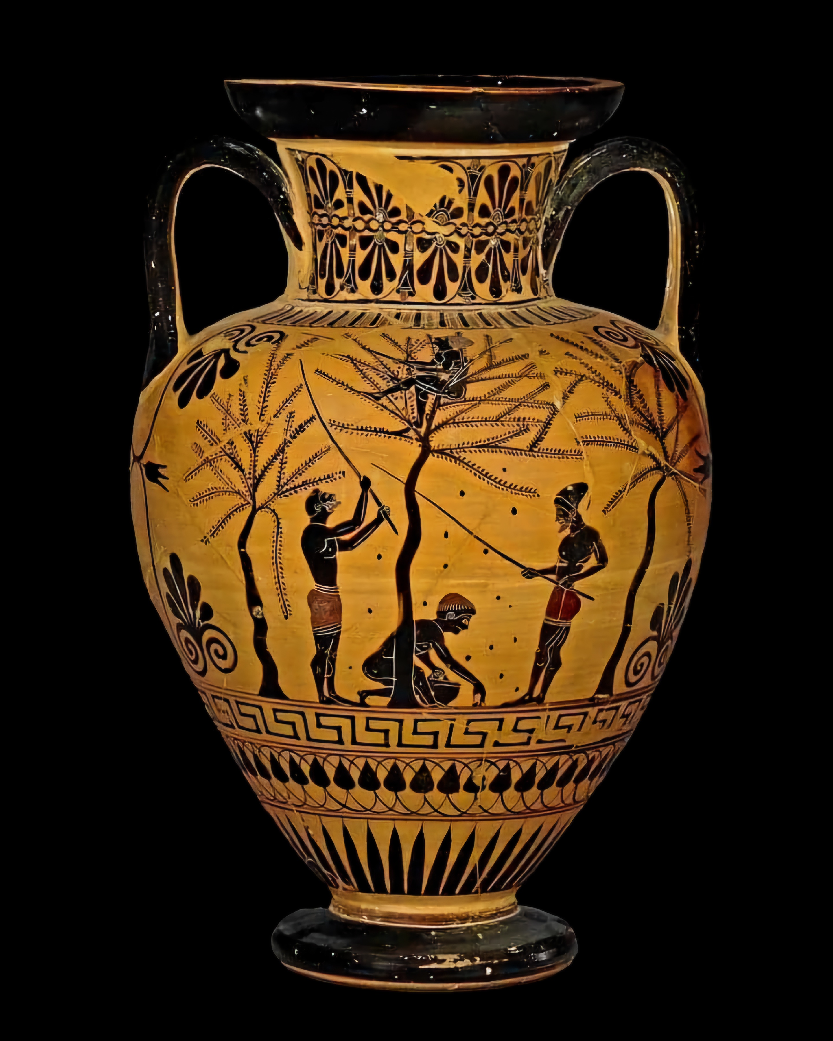 안티메네스 화가가 그리스에서 올리브 수확을 묘사한 장면. 다락방 검은 인물 암포라, 그리스, 기원전 520년경.