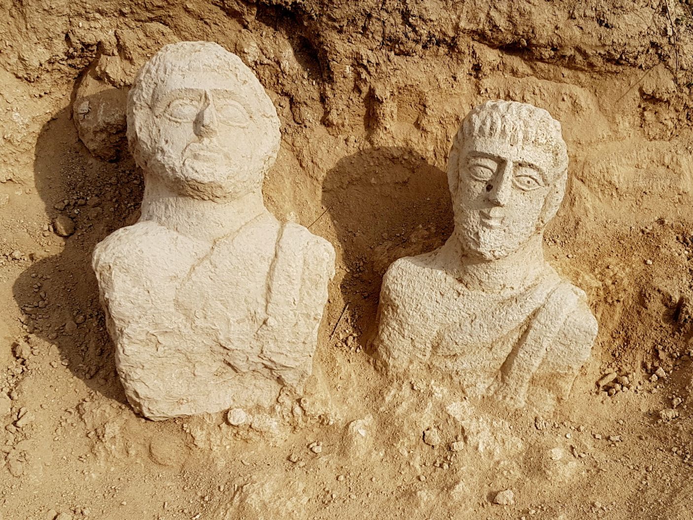 이스라엘 Beit She’an National Park에서 로마시대 석회석제 인물 조각 두 점이 폭우에 땅이 씻겨내려가는 바람에