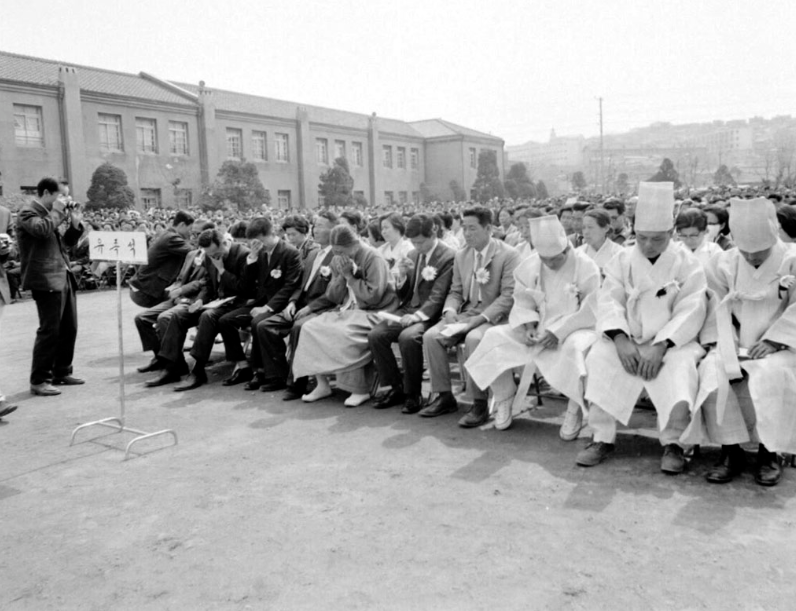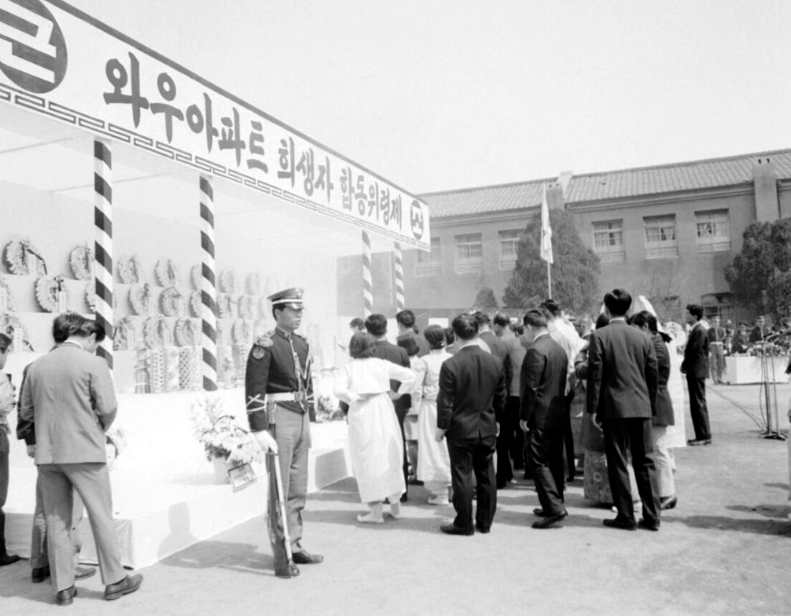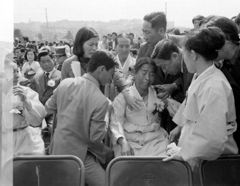 그때나 지금이나 저런 참사에는 합동위령제가 열리기 마련이라, 그때도 사정이 같았는데, 역시 시대 배경이 달라 상주들이 광목천으로 만든 상복을 입은 모습이 무척이나 인상적이다. 유족석이라는 안내판에 앉은 유족 중에서도 맨 앞줄 저 중년 혹은 나이 지긋해 보이는 여인이 눈물을 훔친다.