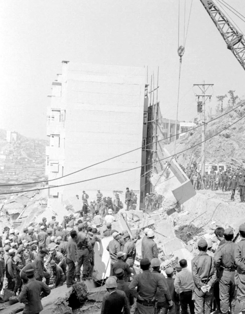 이에 의해 판자촌 밀집지대인 와우산 일대에 5∼6층짜리 아파트 16동이 들어섰다. 문제는 그것이 다 부실공사에 급조공사였다는 점이었다. 개중 한 개 동인 1970년 4월 8일 아침 6시 30분쯤 폭삭 붕괴한 것이다. 아주 폭삭 말이다. 그것도 지은지 불과 4개월 만에 말이다.