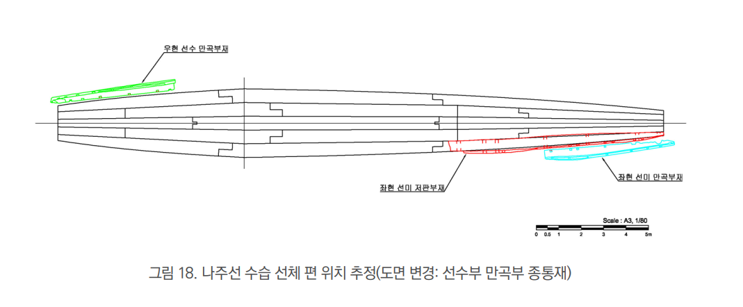 이 목선 조각은 갈수기로 영산강 하상이 드러나면서 인근 주민들에 의해 발견됐으며 나주시는 이 조각 주변에서 추가로 나무못 등을 확인했다.