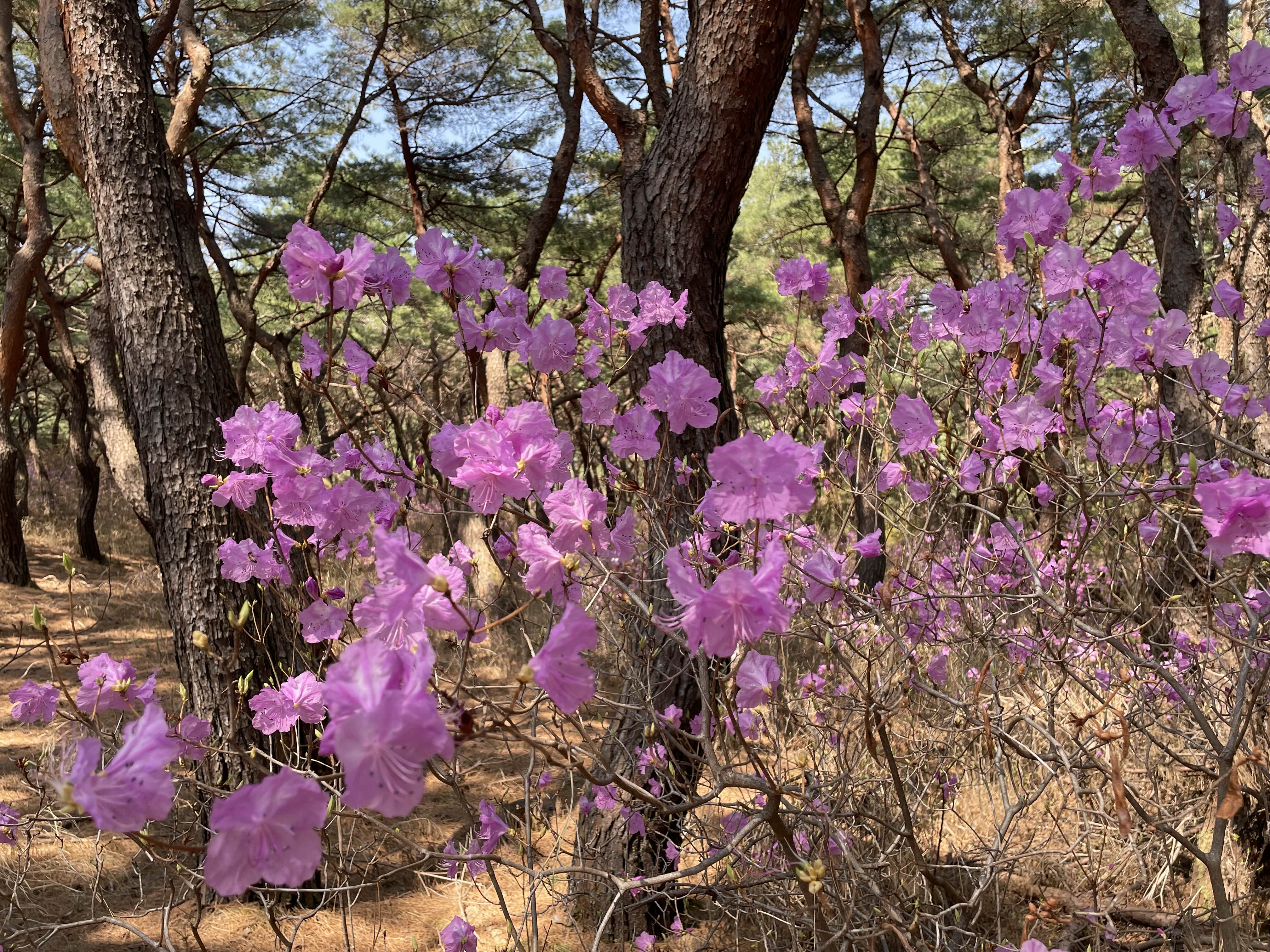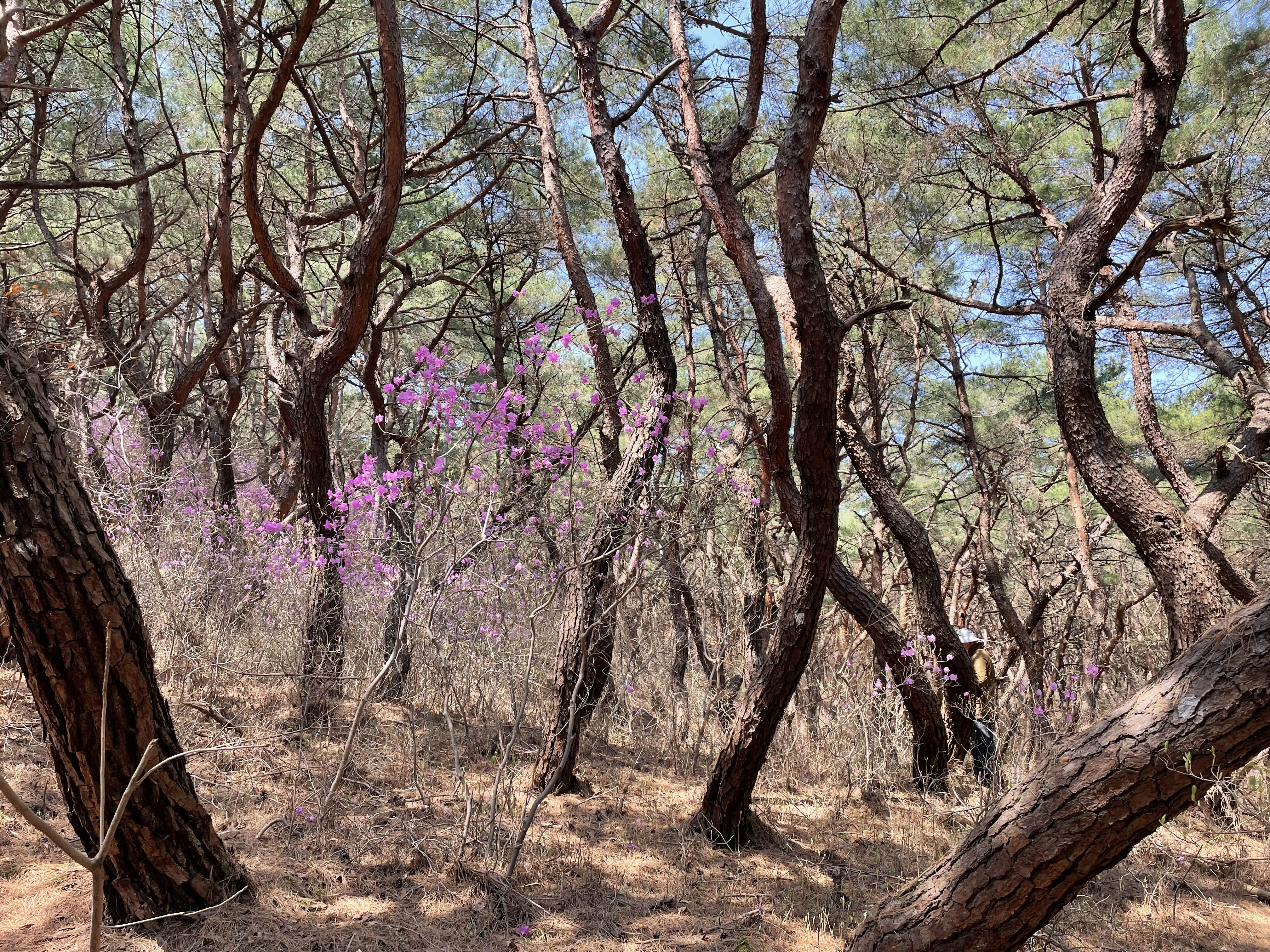 짙은 갈색 소나무 사이로 얼른얼른 보이는 연분홍 진달래가 아직도 생생합니다.