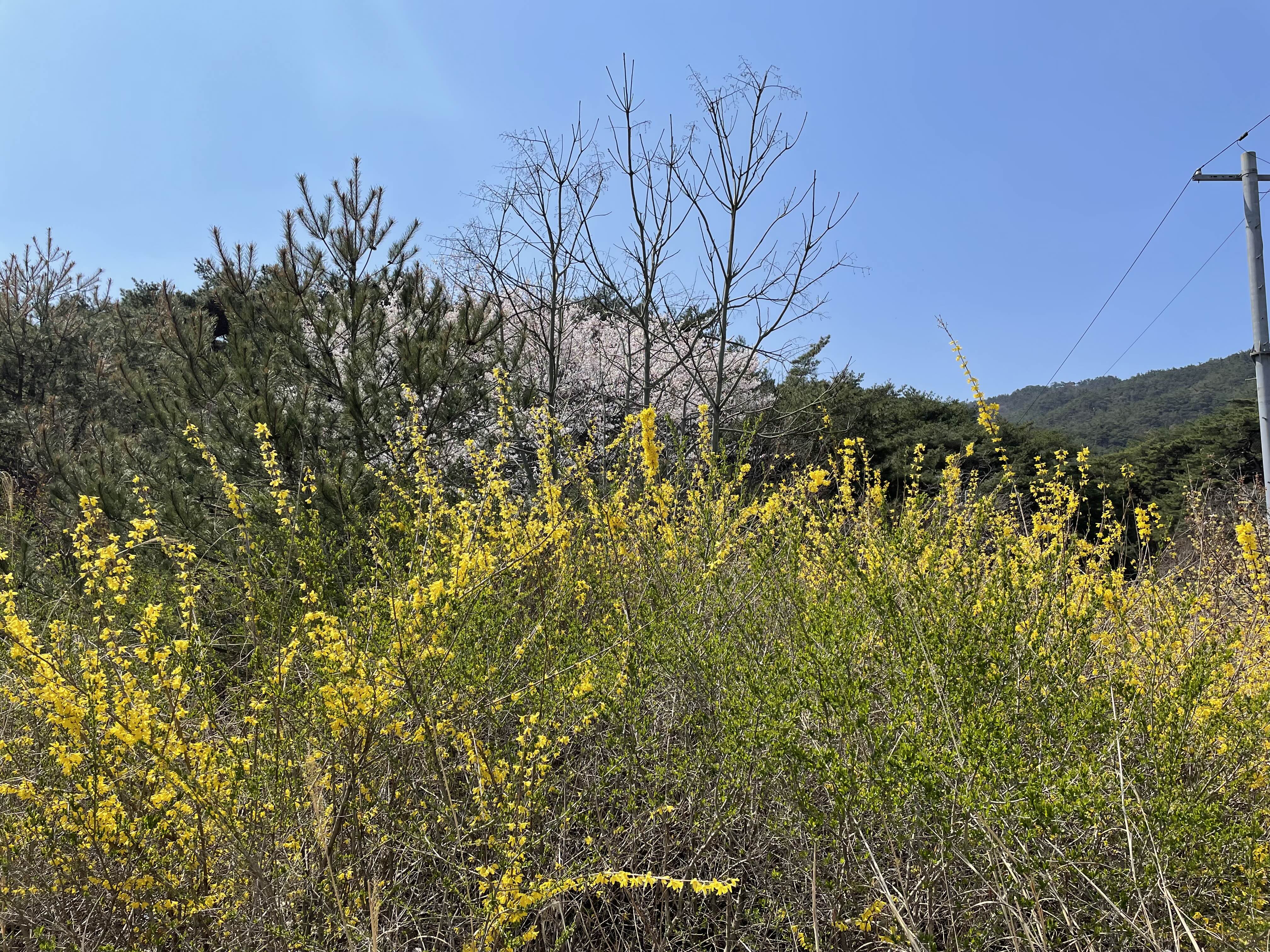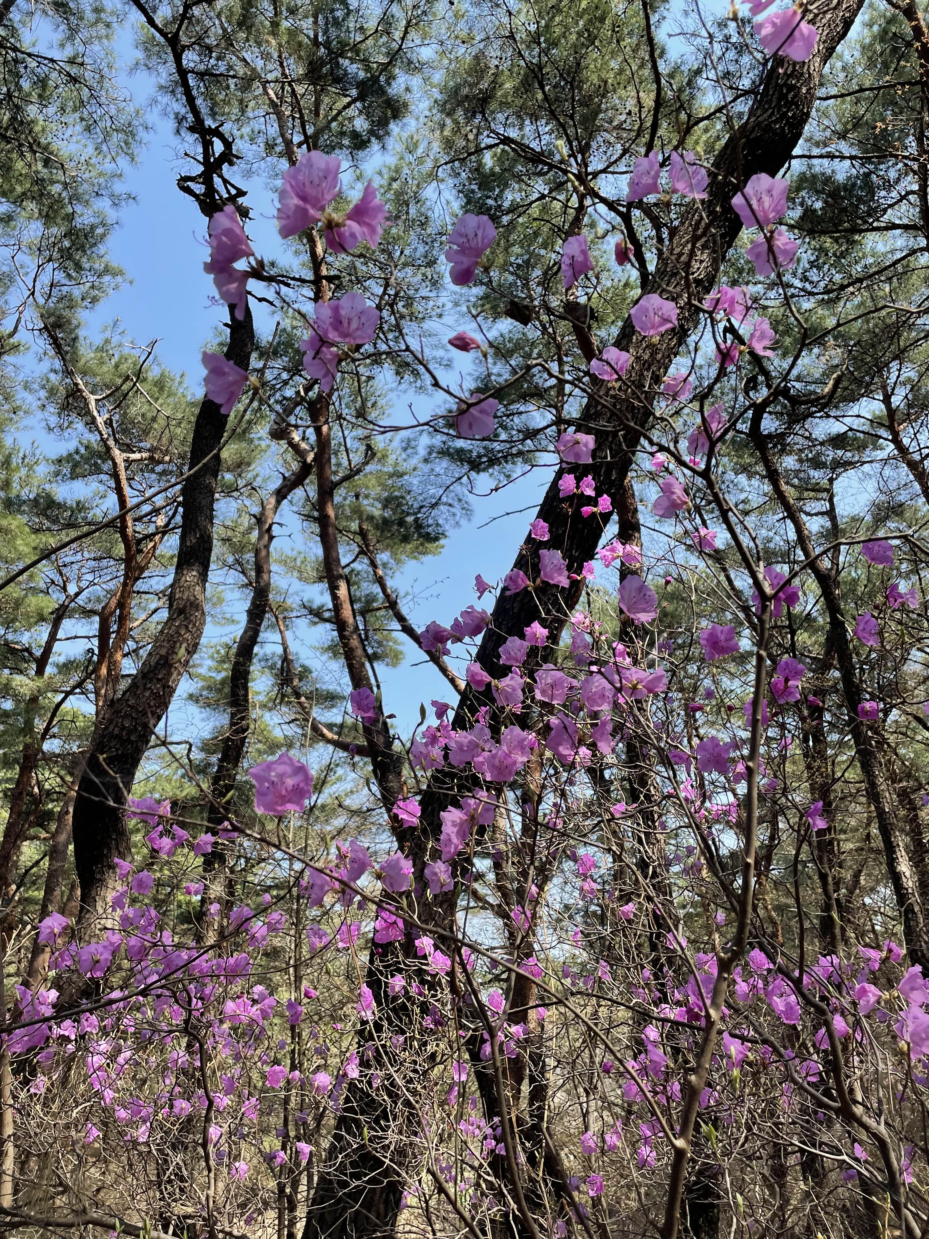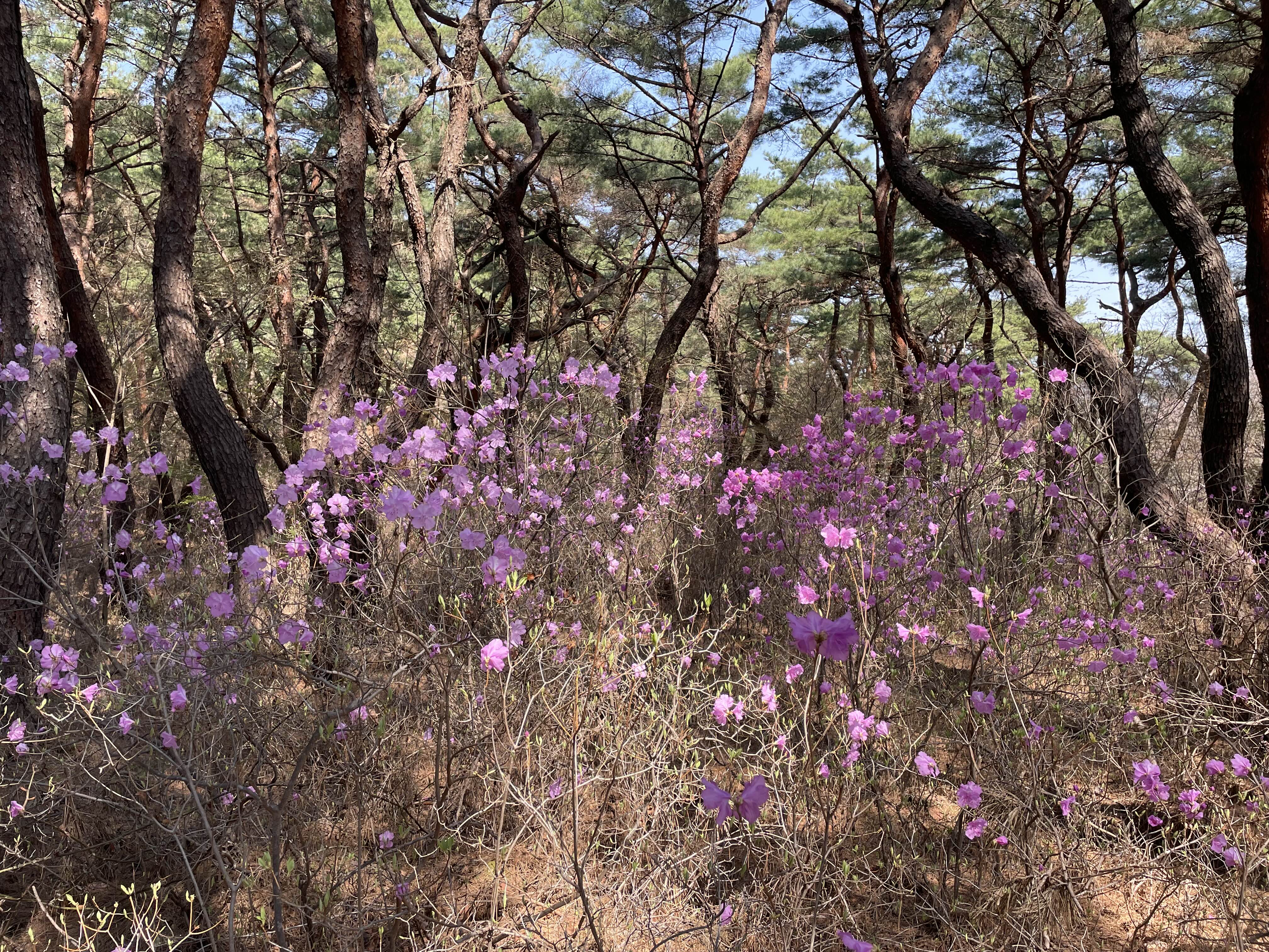짙은 갈색 소나무 사이로 얼른얼른 보이는 연분홍 진달래가 아직도 생생합니다.