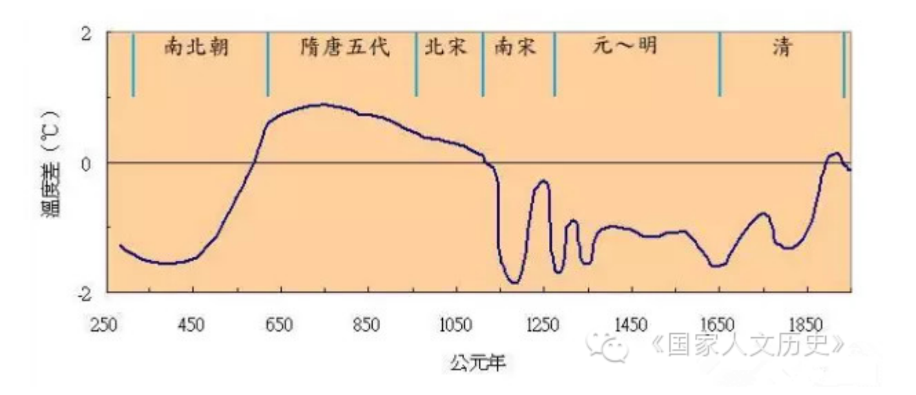 중국에서 정설로 받아들여지는 기후 변동표. 가운데 가로선이 지금 기온이고 이보다 높으면 위로 선이 그려진다. 대략 수당오대-북송때까지가 현재보다 평균기온이 높았고 그 후부터 지금까지는 계속 낮았던 것을 알수 있다.