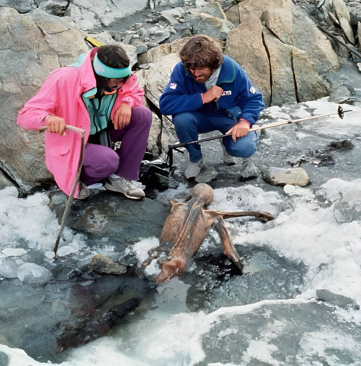 세계 고고학사에 길이 남을 장면이라, 알프스 동토층이 녹으면서 출현한 이른바 아이스맨 외치 Ötzi the Iceman 라는 분이 출현하는 순간을 포착한 것이다.