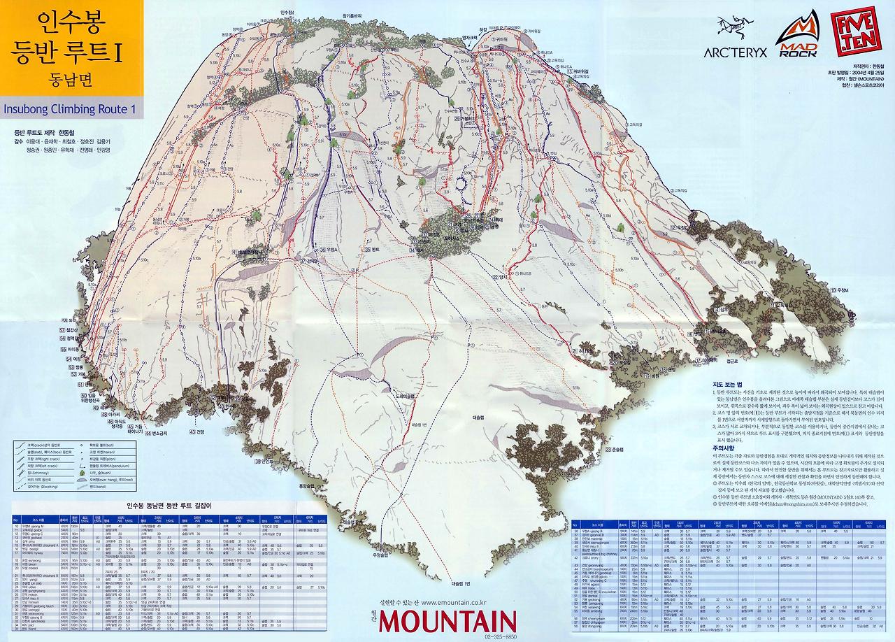 꼭대기에 올라갈 수 있는 암벽등반로가 빽빽하게 나 있다.