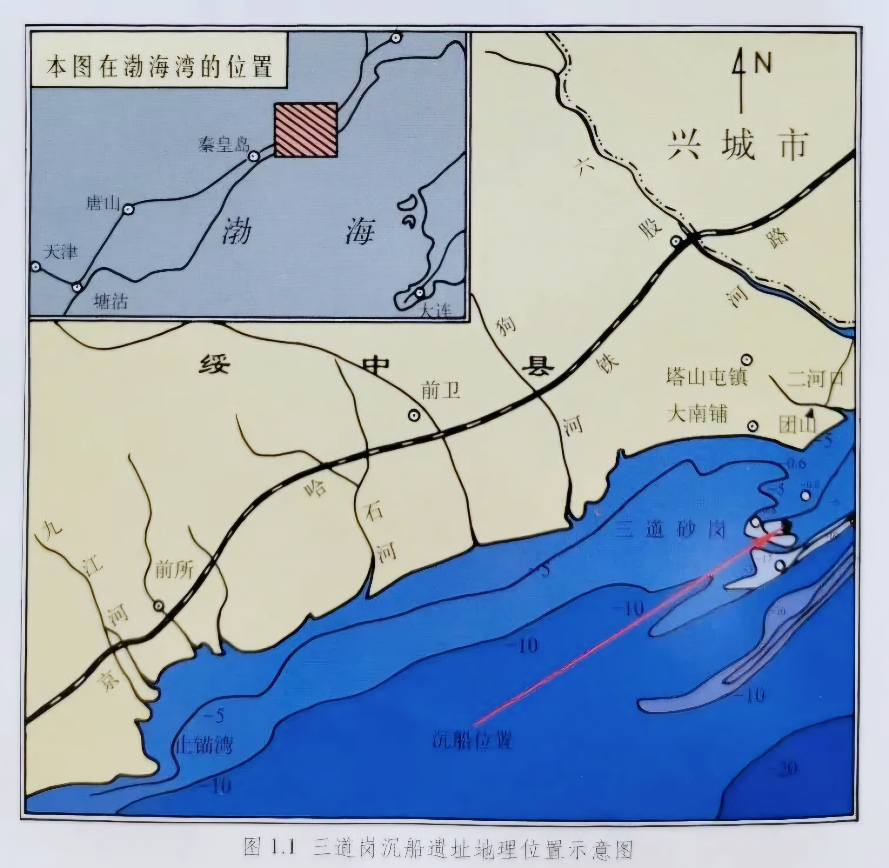 삼도강三道岗 원대元代 침몰선沉船은 호로도시葫芦岛市 수중현绥中县 탑둔지塔屯镇 대남포촌大南铺村 남쪽 약 5.5 公里的 삼도강三道岗 해역에 소재한다.